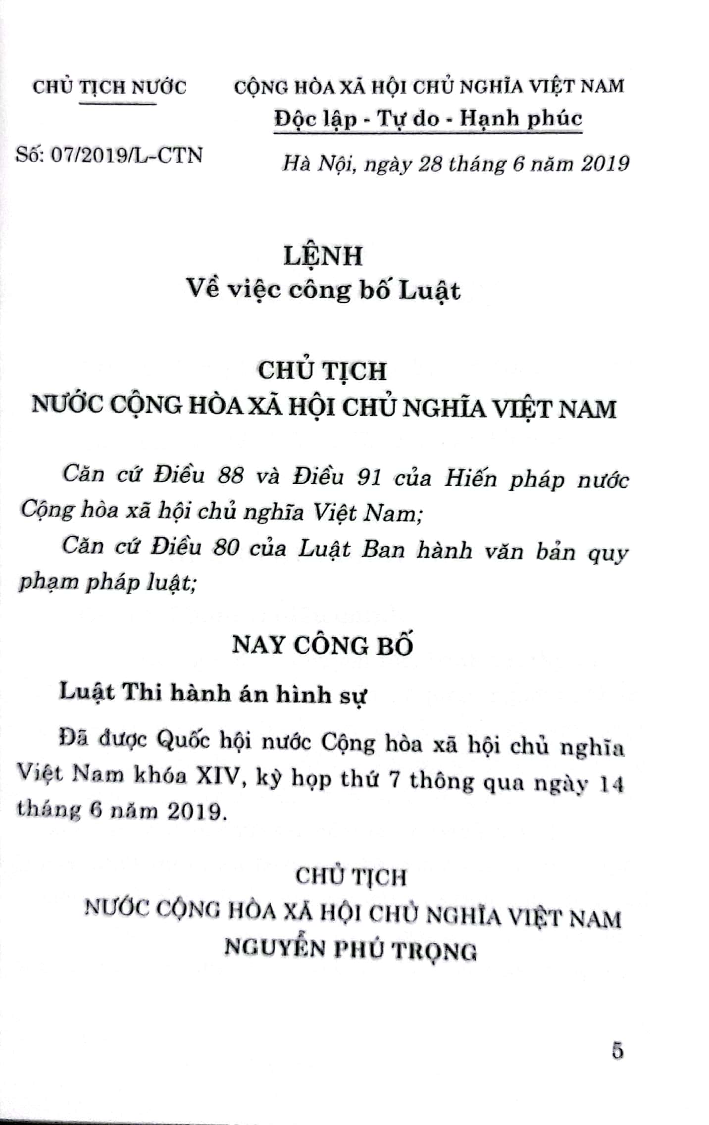 Luật Thi hành án hình sự được Quốc hội nước Cộng hòa xã hội chủ nghĩa Việt Nam khóa XIV, kỳ họp thứ 7 thông qua ngày 14/6/2019, có hiệu lực thi hành 01/01/2020. Luật