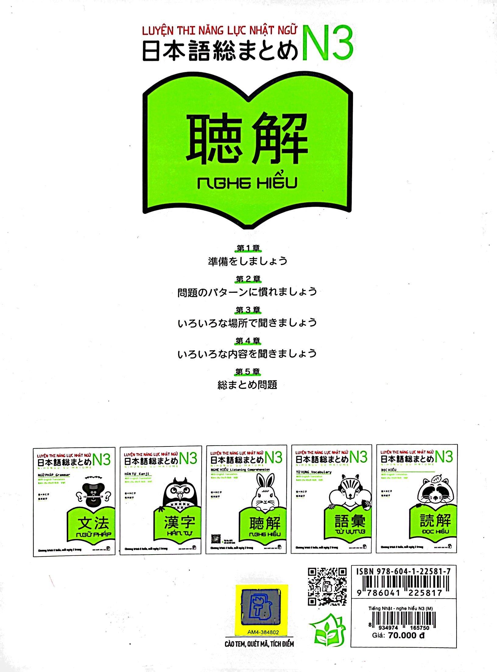 Bộ sách Nihongo somatome N3 này được xuất bản nhằm giúp bạn có được những kiến thức cần thiết một cách nhanh chóng, hiệu quả và hoàn thành tốt kỳ thi năng lực Nhật ngữ N3. Bộ sách này có 5 quyển: Hán tự (Kanji), Từ vựng (Goi), Đọc hiểu (Dokkai), Nghe hiểu (Choukai) và Ngữ pháp (Bunpou), do Nhà xuất bản ASK xuất bản và là một trong số các tựa sách học tiếng Nhật hàng đầu trong hệ thống phân phối sách Kinokuniya lớn nhất Nhật Bản. Hi vọng bộ sách sẽ giúp các bạn chuẩn bị tham gia kỳ thi năng lực Nhật ngữ JLPT nắm được những nội dung kiến thức cần phải có trong năng lực Nhật ngữ N3 một cách nhanh chóng, hiệu quả và tổng quát nhất trong khoảng thời gian từ 4 đến 6 tuần.