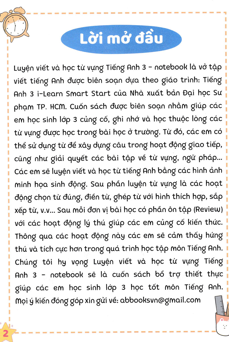 Chúng tôi hy vọng Luyện viết và học từ vựng tiếng Anh 3 - notebook sẽ là cuốn sách bổ trợ thiết thực giúp các em học sinh lớp 3 học tốt môn Tiếng Anh.
