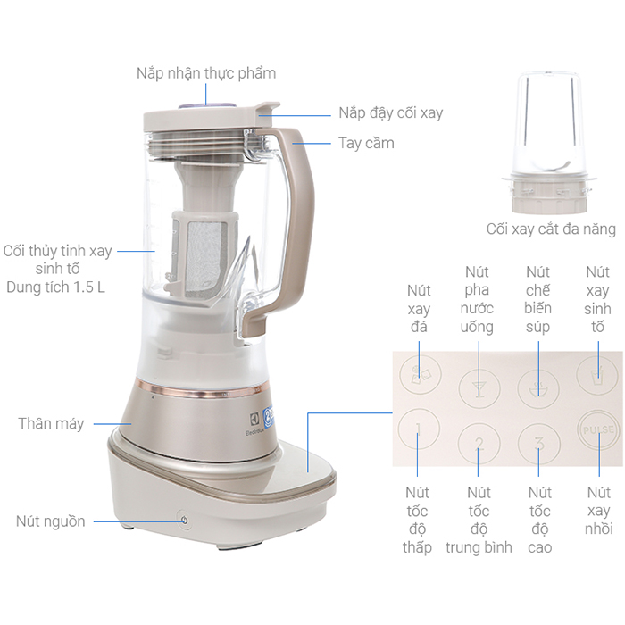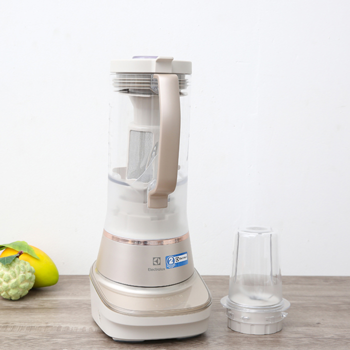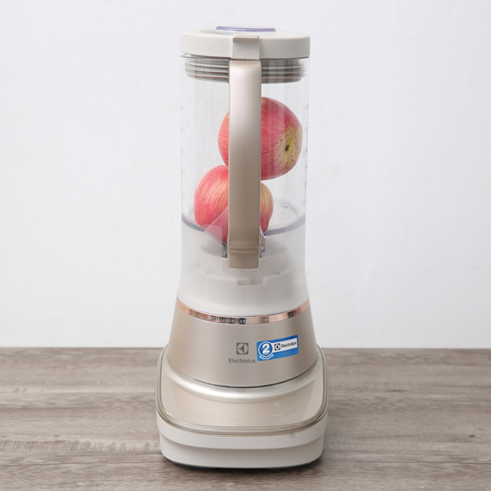 Máy xay sinh tố Electrolux sang trọng trong màu trắng bạc với viền vàng đồng và cối trong suốt, thiết kế hiện đại nổi bật ở mọi góc nhìn Cối xay chất liệu nhựa Tritan cao cấp, trong suốt