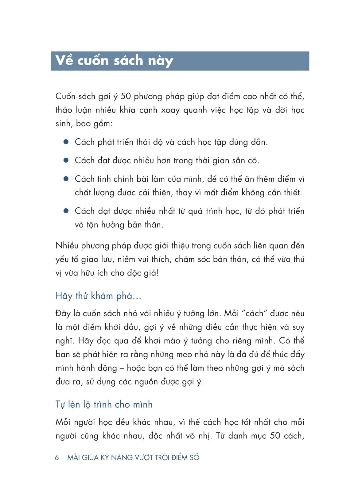 MÀI GIŨA KỸ NĂNG – VƯỢT TRỘI ĐIỂM SỐ với 50 mẹo nhỏ linh hoạt mà hữu ích cần có cho các bạn học sinh/sinh viên với các chỉ dẫn chi tiết: tự lên lộ trình học tập cho riêng bản thân; kiểm soát thời gian trong việc ôn tập và các kỳ thi; tinh chỉnh bài làm để đạt thêm điểm cộng; chọn lọc kiến thức một cách chủ động và bồi dưỡng sức khỏe tinh thần. Đây cũng là cuốn sách thứ 3 trong bộ Cẩm nang sinh viên, được viết bởi Stella Cottrell – chuyên gia giáo dục và hướng nghiệp người Anh, tác giả của Lộ trình bạn đi Tương lai bạn chọn và Tháo gỡ căng thẳng Mở lối tiềm năng – những cuốn sách hữu ích nổi tiếng với các bạn trẻ.