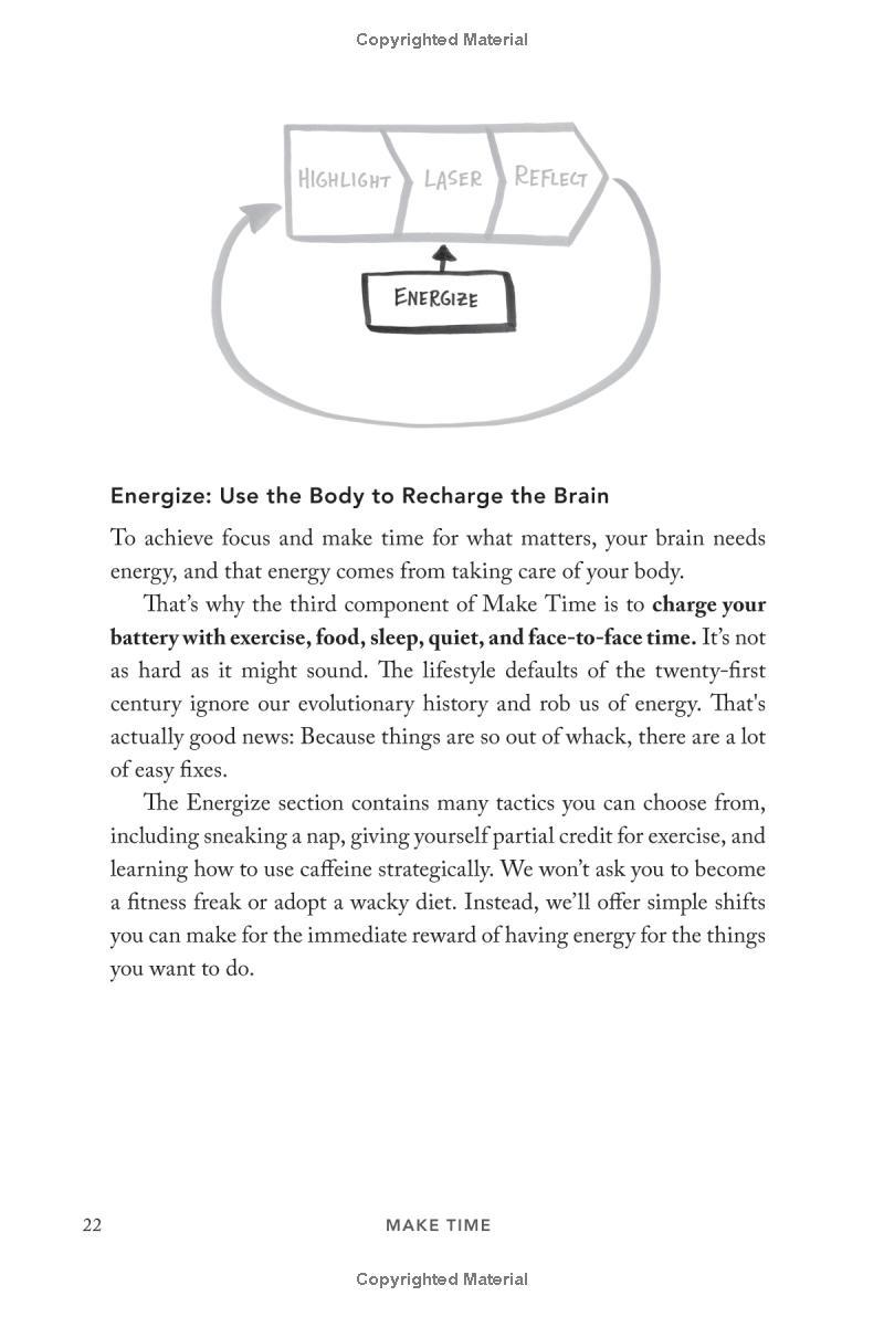 From the New York Times bestselling authors of Sprint, a simple 4-step system for improving focus, finding greater joy in your work, and getting more out of every day. Nobody ever looked at an empty calendar and said, "The best way to spend this time is by cramming it full of meetings!" or got to work in the morning and thought, Today I'll spend hours on Facebook! Yet that's exactly what we do. Why? In a world where information refreshes endlessly and the workday feels like a race to react to other people's priorities faster, frazzled and distracted has become our default position. But what if the exhaustion of constant busyness wasn't mandatory? What if you could step off the hamster wheel and start taking control of your time and attention? That's what this book is about. As creators of Google Ventures' renowned "design sprint," Jake and John have helped hundreds of teams solve important problems by changing how they work. Building on the success of these sprints and their experience designing ubiquitous tech products from Gmail to YouTube, they spent years experimenting with their own habits and routines, looking for ways to help people optimize their energy, focus, and time. Now they've packaged the most effective tactics into a four-step daily framework that anyone can use to systematically design their days. Make Time is not a one-size-fits-all formula. Instead, it offers a customizable menu of bite-size tips and strategies that can be tailored to individual habits and lifestyles. Make Time isn't about productivity, or checking off more to-dos. Nor does it propose unrealistic solutions like throwing out your smartphone or swearing off social media. Making time isn't about radically overhauling your lifestyle; it's about making small shifts in your environment to liberate yourself from constant busyness and distraction. A must-read for anyone who has ever thought, If only there were more hours in the , Make Time will help you stop passively reacting to the demands of the modern world and start intentionally making time for the things that matter .