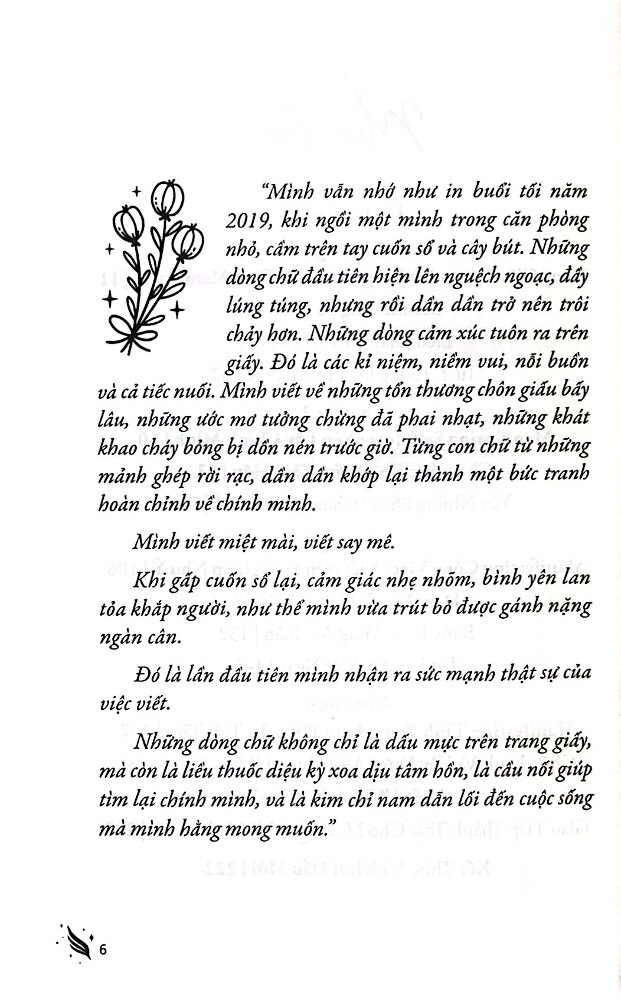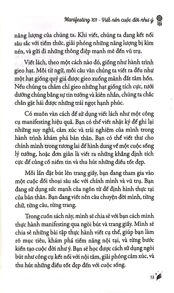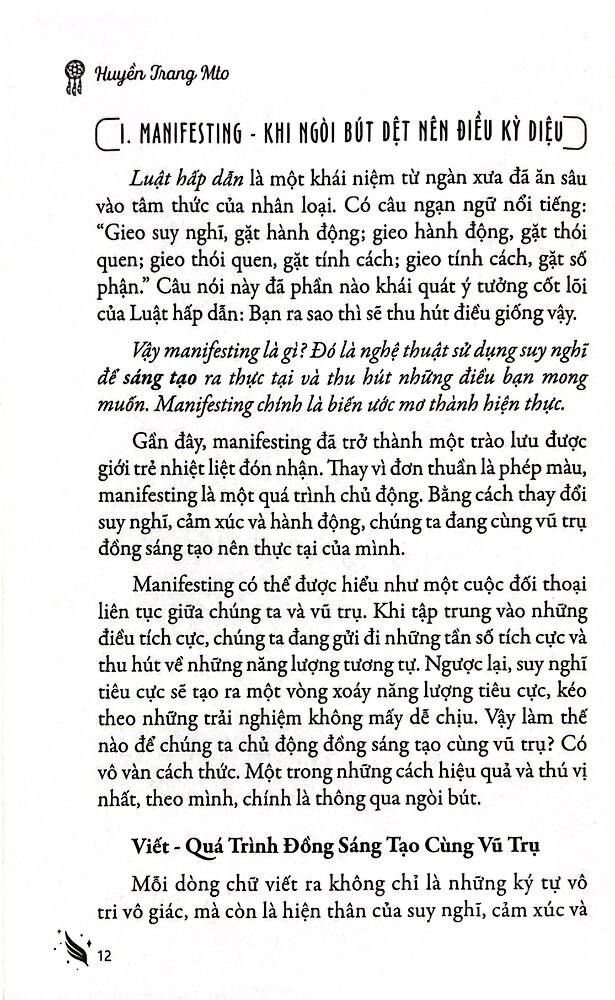 Manifesting 101 - "Viết Nên Cuộc Đời Như Ý" Cuốn sách "Manifesting 101 - Viết nên cuộc đời như ý" của Huyền Trang Mto tập trung vào việc sử dụng sức mạnh của viết lách để kết nối với bản thân và vũ trụ, từ đó hiện thực hóa mong muốn. Nội dung xoay quanh liệu pháp viết như một công cụ để giải phóng cảm xúc, tìm kiếm sự chữa lành và phát triển sức khỏe tinh thần. Cuốn sách hướng dẫn người đọc cách sử dụng manifesting thông qua việc viết, từ việc yêu bản thân, chăm sóc sức khỏe tinh thần đến xây dựng sự nghiệp, tình yêu và các mối quan hệ. Các chủ đề chính trong sách: Manifesting qua viết lách - Giới thiệu khái niệm manifesting, luật hấp dẫn và xem liệu pháp viết như là một phương pháp để đồng sáng tạo với vũ trụ, viết nên cuộc đời như ý. Yêu bản thân - Nuôi dưỡng tình yêu với chính mình qua viết lách, chăm sóc sức khỏe tinh thần, chấp nhận những điểm chưa hoàn hảo và gieo hạt giống tích cực trong tâm hồn. Sự nghiệp và tình yêu - Sử dụng viết lách để định hướng mục tiêu sự nghiệp và xây dựng các mối quan hệ lành mạnh. Thực hành viết - Các bài tập thực hành như viết nhật ký buổi sáng, viết những bức thư không gửi đi, và các phương pháp khác nhằm củng cố mục tiêu và kết nối với cảm xúc sâu kín. Mỗi ước mơ của bạn là một hạt giống, và cuốn sách này chính là mảnh đất màu mỡ để chúng nảy mầm, vươn lên và nở rộ!