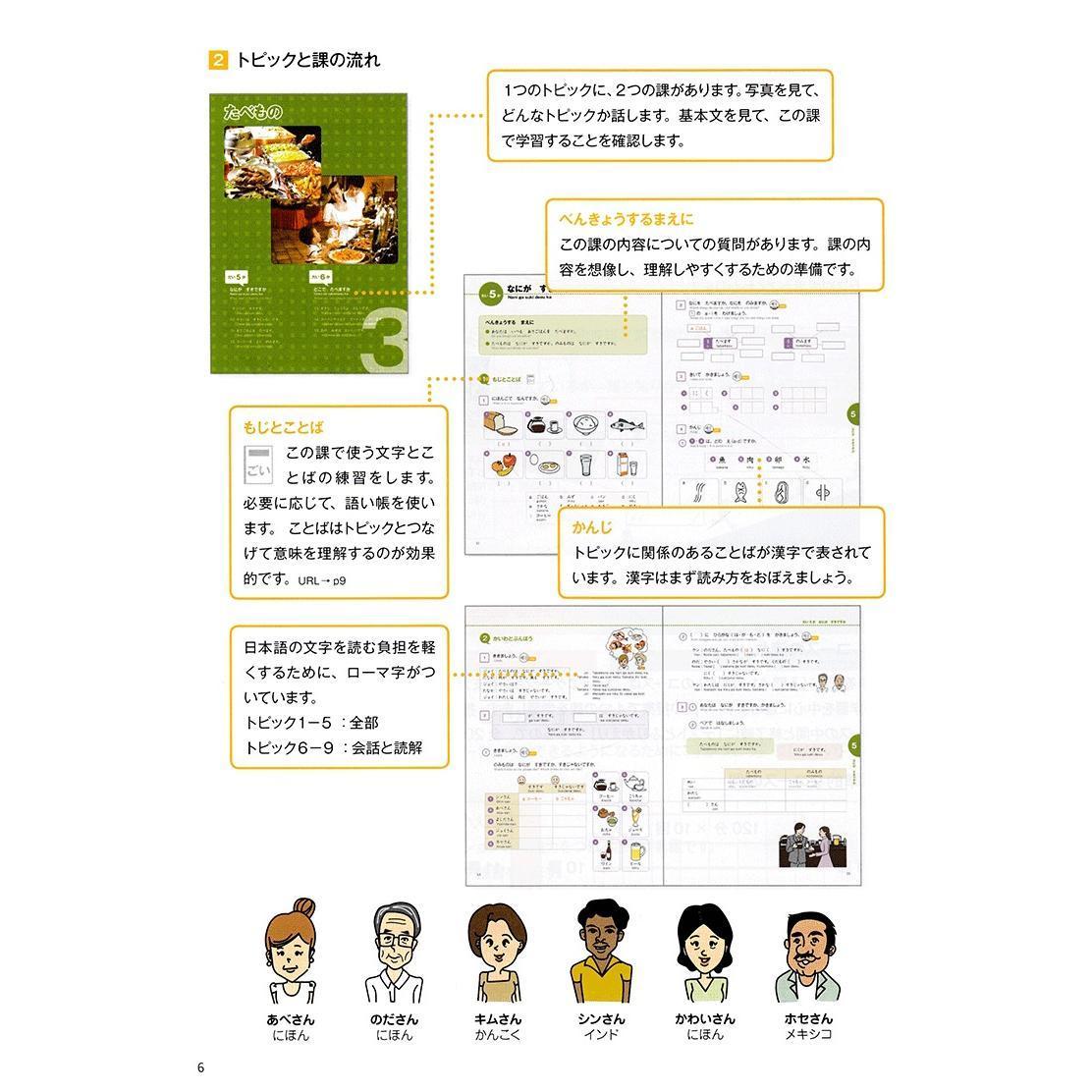 Ở trình độ Nhập môn – trình độ dành cho người mới bắt đầu học, người học sẽ thực hiện các hoạt động giao tiếp đơn giản như: chào hỏi, nói về món ăn yêu thích hay về sở thích của bản thân. Ở trình độ Trung cấp, người học sẽ đọc, nghe tiếng Nhật thực tế, đồng thời luyện tập để có thể nói những đoạn dài về bản thân mình. Nói chung trình độ nào của giáo trình cũng hướng tới mục tiêu hiểu biết lẫn nhau thông qua việc giao tiếp thực tế bằng tiếng Nhật.