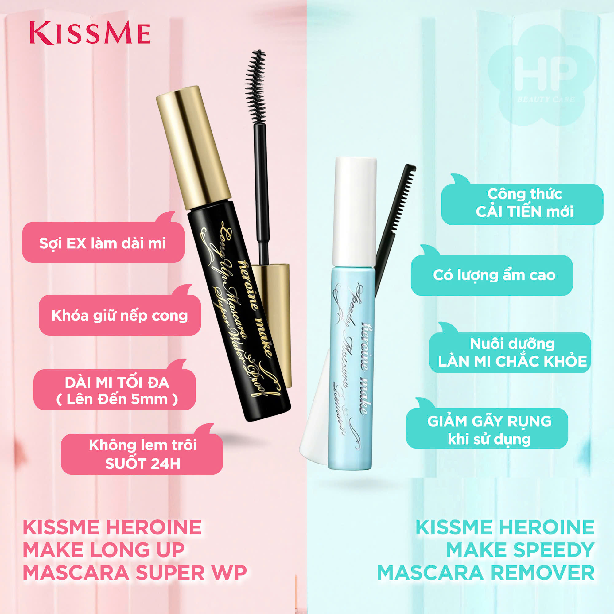 Thương hiệu: Kissme Xuất xứ: Nhật Bản HSD: 5 năm kể từ ngày sản xuất 1. Mascara Nâng Cong Dài Mi (6g):    Mascara màu đen tuyền có chất mực được chiết xuất từ Nhân