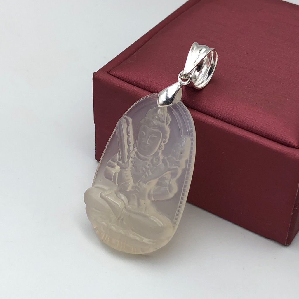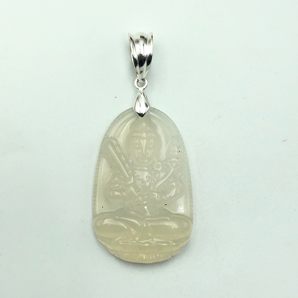 Mặt Phật Bà đứng Cẩm Thạch xanh trắng lí - Chất liệu: Ngọc Cẩm Thạch tự nhiên. - Màu sắc: Xanh lí phớt trắng - Kích thước: ngang 49mm, cao 23mm, dày 4mmx8mm - Mã kiểm định: 86691 - Tiêu chuẩn