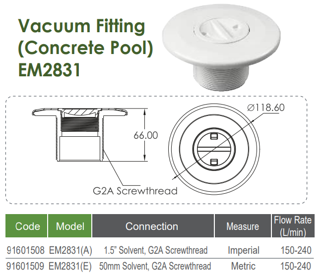 Mua tại TiktokMắt hút vệ sinh Emaux EM2831(A) Model: EM2831(A) Code: 91601508 Lưu lượng/ Flow ( m3/hr ): 9 m3/h Khớp nối/ Union Connection (mm ): 1.5 in Hãng sản xuất: Emaux – China Ống hút và