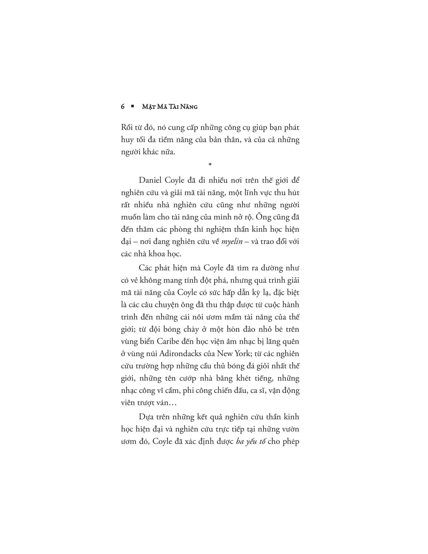 Dựa trên những thành tựu xuất sắc của ngành thần kinh học và nghiên cứu mới nhất trong quá trình đi tới 9 địa chỉ sản sinh ra rất nhiều tài năng của thế giới – từ sân bóng chày ở vùng Ca-ri-bê đến học viện âm nhạc cổ điển phía bắc New York – Coyle đã chỉ ra 3 yếu tố then chốt cho phép bạn phát triển tài năng và tối ưu hóa khả năng của m.ình trong các lĩnh vực thể thao, nghệ thuật, âm nhạc, toán học hay bất kỳ điều gì khác.