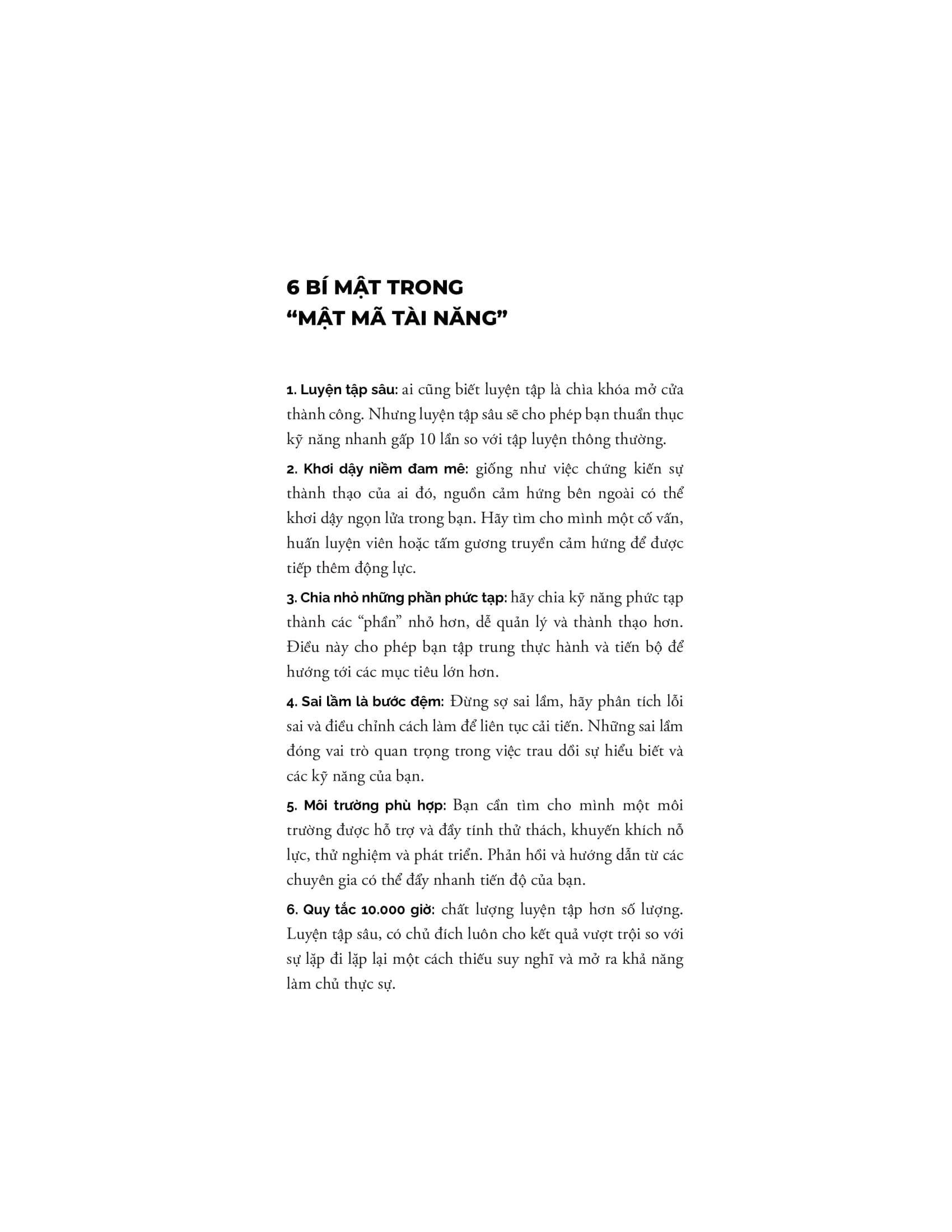 Dù bạn đang huấn luyện cho một đội bòng bầu dục hay dạy một đứa trẻ chơi đàn piano, viết tiểu thuyết hay cố gắng cải thiện cú vung gậy trong môn bóng chày thì cuốn sách mang tính cách mạng này sẽ chỉ cho bạn biết cách nuôi dưỡng và phát triển tài năng thông qua việc khai thác và sử dụng một cơ chế mới được khám phá của não bộ.