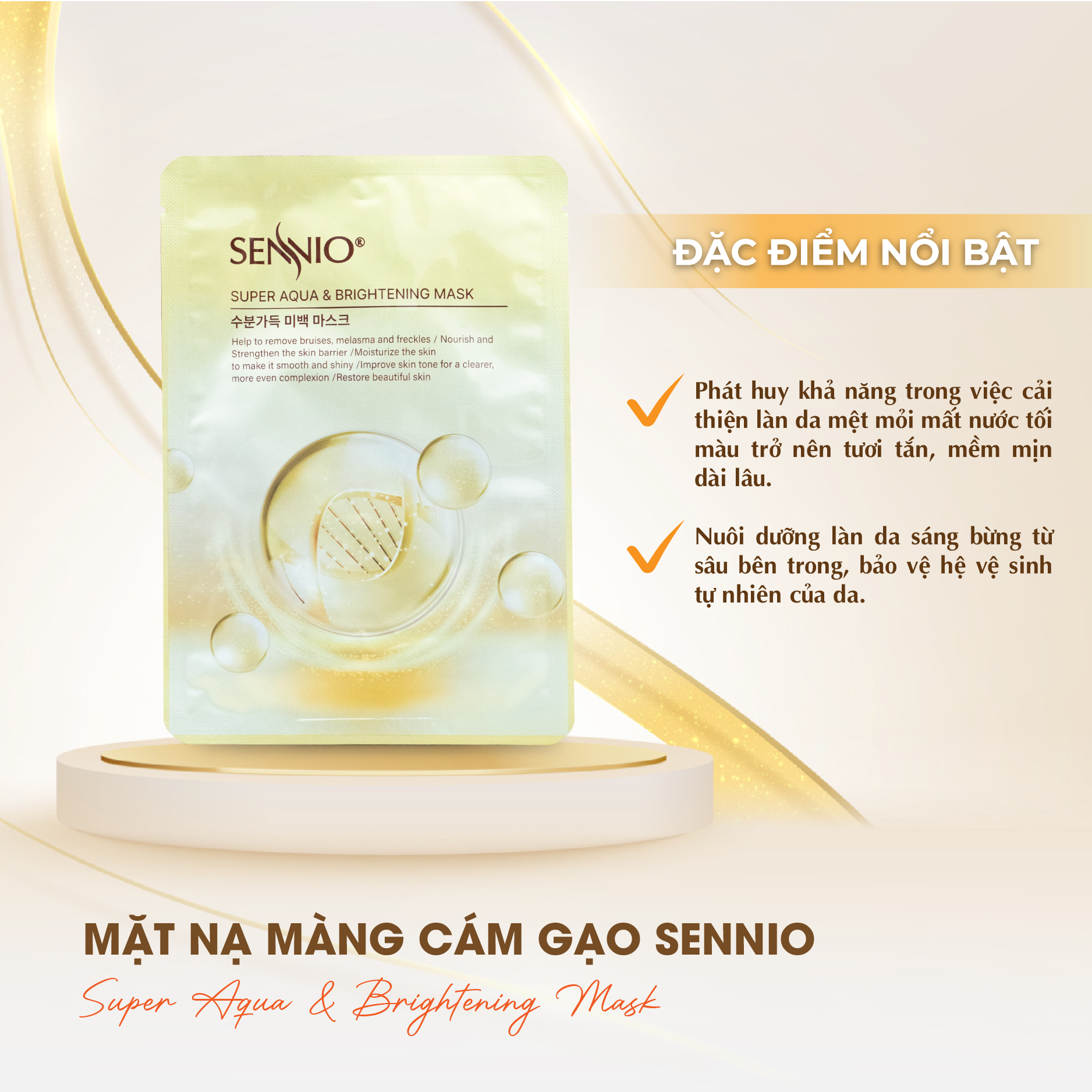 - Mặt nạ cám gạo cấp ẩm dưỡng trắng da Sennio SNO 821 ứng dụng công nghệ lên men tự nhiên tạo ra những hạt tinh chất có kích thước siêu nhỏ, tăng khả năng hấp thụ và thẩm thấu gấp nhiều lần mang lại hiệu quả trên da rõ rệt.