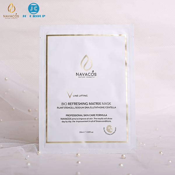Mặt nạ sinh học Navacos Bio Refreshing Matrix Mask là mặt nạ sinh học thế hệ mới với cấu trúc đặc biệt mỏng, nhẹ, dai, đàn hồi, chứa hàm lượng cao dịch chiết tế bào gốc thực vật, các dưỡng chất thiên nhiên Công thức Chăm sóc da chuyên nghiệp quy tụ 4+ hoạt chất đỉnh cao trong làng chống lão hóa và Nâng cơ. Thành phần – Mặt nạ sinh học Navacos có Hàm lượng rất cao dịch chiết tế bào gốc từ thực vật, và các chiết xuất thiên nhiên khác giúp nuôi dưỡng, phục hồi tế bào da hư tổn. – Sodium DNA: giúp phục hồi hư tổn tế bào, kích thích sản sinh tế bào da mới, dưỡng da căng bóng. – Glutathione: giúp làm trắng và ngăn ngừa lão hóa – Acetyl Hexapeptide-8: thành phần botox tự nhiên giúp trám đầy các rãnh nhăn, xóa đi nếp nhăn và định hình cơ mặt. – Galactomyces Ferment Filtrate: Nấm men được ủ trong quá trình lên men trong Sake của Nhật Bản giúp cải thiện lớp màng ẩm của da, làm sáng da hơn, kiểm soát điều tiết bã nhờn, giảm mụn trứng cá và  đồng thời làm tăng độ đàn hồi của da.   Công dụng  – Cấp ẩm, và dưỡng ẩm chuyên sâu cho da – Dưỡng sáng, giúp da mềm mại và tươi trẻ – Làm đầy các rãnh nhăn, xóa nếp nhăn, và ngăn ngừa lão hóa da, chảy xệ. – Phục hồi cấu trúc làn da hư tổn, giúp da trở nên khỏe mạnh, căng mướt – Làm săn chắc da, định hình cơ mặt, nâng cơ tạo khuôn mặt V-line Hướng dẫn sử dụng Bước 1: Mở gói Mặt nạ sinh học Navacos và mở 3 lớp của mặt nạ ra Bước 2: Tách bỏ lớp lưới, sau đó đặt lớp Mặt nạ lên da mặt, và từ từ gỡ bỏ lớp film (màng) nhựa màu trắng đục. Bước 3: Dùng tay điều chỉnh nhẹ nhàng lớp Mặt nạ sinh học Navacos để ôm sát gương mặt. Bước 4: Giữ yên trên da trong khoảng 30 – 45 phút, có thể đắp qua đêm đến sáng. Bước 5: Gỡ bỏ mặt nạ ra và có thể dùng chỗ tinh chất còn thừa trong gói mặt nạ thoa lên mặt và dùng các tay vỗ nhẹ để các thành phần dưỡng chất hấp thụ vào da hoàn toàn. ► Lưu ý Tránh tiếp xúc trực tiếp vào mắt, chỉ dùng ngoài da. Để xa tầm tay của trẻ em, bảo quản nơi khô ráo, thoáng mát, tránh ánh nắng mặt trời. Mặt nạ chỉ sử dụng một lần duy nhất sau khi mở bao bì. THÔNG TIN SẢN PHẨM Thương hiệu: NAVACOS  Xuất xứ: Hàn Quốc NSX & HSD: In trên bao bì chai  JC Cell Beauty - phân phối mỹ phẩm chính hãng Cam kết sản phẩm 100% là hàng chính hãng, có giấy tờ chứng nhận Dịch vụ tư vấn chuyên nghiệp với đội ngũ tư vấn viên nhiệt tình sẵn sàng giải đáp mọi thắc mắc của khách hàng liên quan tới sản phẩm