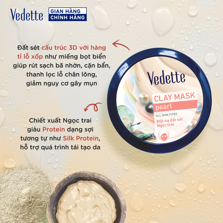 Mặt nạ đất sét sạch sâu dịu nhẹ Ngọc Trai Vedette Clay Mask Pearl thấm hút tối đa lớp bụi bẩn và bã nhờn từ sâu trong lỗ chân lông, giữ da luôn thoáng sạch
