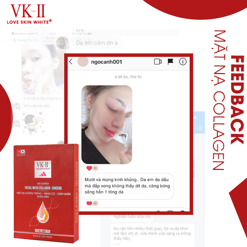 Thành phần : Water, Panax Ginseng Extract, Glycerin, Paraffinum Liquidum, Dimethicone, Carbomer, Aloe Vera Callus Extract, Phenoxyethanol ( 1% ), Tocopherol, Parfum. Công dụng :   - Mặt nạ Nâng Cơ VK II chiết xuất từ Nhân Sâm : cung cấp dưỡng chất thẩm thấu sâu vào da, nhằm tăng cường độ đàn hồi giúp nuôi dưỡng và cải thiện nếp nhăn, nâng cơ mang đến làn da trắng sáng, mềm mịn và tươi trẻ  - Với chiết xuất từ 100% từ thảo mộc thiên nhiên phù hợp với mọi loại da, mang lại cảm giác thư giãn dễ chịu trong suốt quá trình đắp  - Hyaluronic Acid (HA) : phân tử siêu nhỏ đi sâu cấp nước và nuôi dưỡng da, giúp da sáng mịn, căng đẹp hơn  - NMF : nhân tố gồm 42 amino acid có chức năng cung cấp nước và giữ ẩm cho da, giúp lưu thông máu, ngắn ngừa mụn, nám, tàn nhang giúp làm sáng da, cải thiện nếp nhăn và thúc đẩy vẻ tươi trẻ cho da. *HDSD   - Bước 1 : Vệ sinh da mặt sạch sẽ bằng toner/nước và lau khô  - Bước 2 : Đắp mặt nạ lên mặt, điều chỉnh để mặt nạ bám khít vào da  - Bước 3 : Thư giãn ít nhất từ 15-20 phút  - Bước 4 : Vỗ nhẹ mặt sau khi sử dụng để các dưỡng chất thấm sâu vào da, sau đó rửa sơ lại bằng nước sạch.