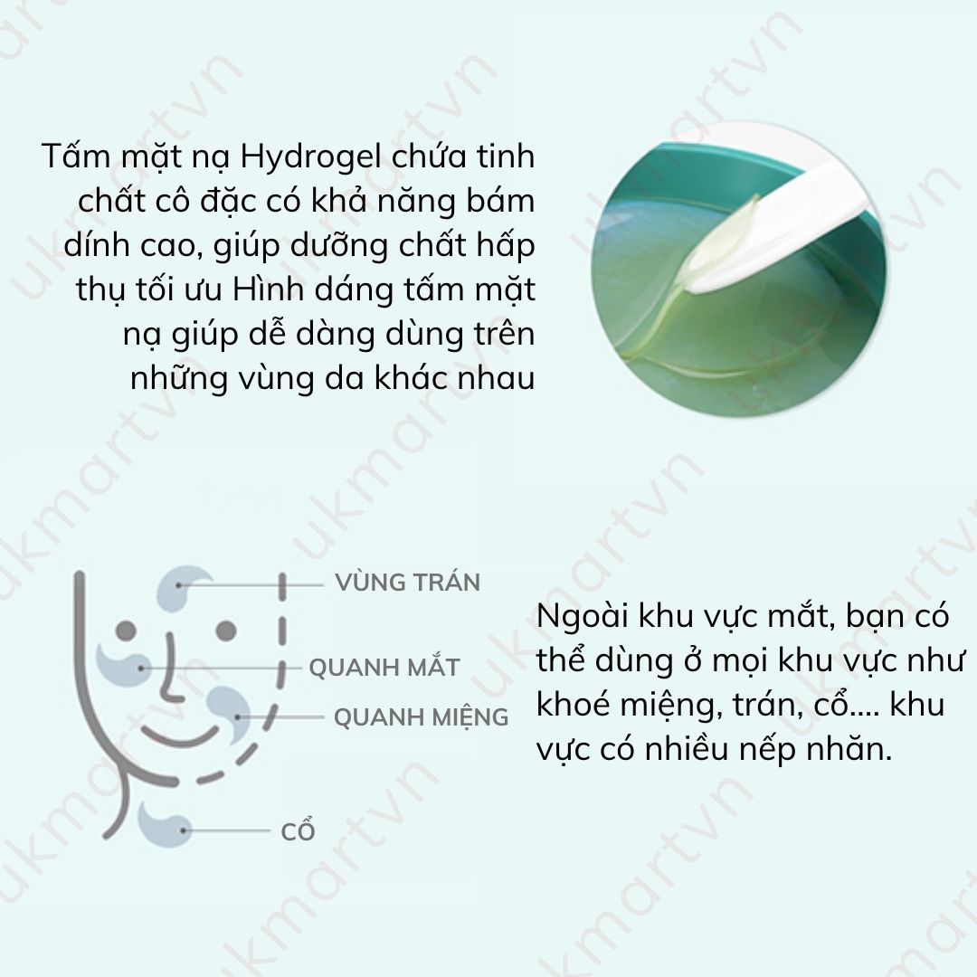 THÀNH PHẦN: Nước tinh khiết, Glycerin, Dipropylene Glycol, Carrageenan, Castor Oil Hydrolyzed from PEG-60 Hydrogenated Castor Oil, Carbomer, Butylene Glycol, Glucose, Xanthan Gum, Potassium Chloride, Sodium Hyaluronate, Hydroxyethylcellulose, Diamond Powder (100ppm), Gold (100ppm), Ethylhexylglycerin, Castor Oil, Tocopheryl Acetate, Allantoin, Grapefruit Extract, Beta-Glucan, Tetrasodium EDTA, Propolis Extract, Eucalyptus Leaf Extract, Artemisia Vulgaris Extract, Seagrass Extract, Centella Asiatica Extract, Green Tea Extract, Fragrance, Hydrolyzed Collagen, Caprylyl Glycol, Titanium Dioxide, CI 77019 (Mica), CI 77891 (Titanium Dioxide). CÔNG DỤNG: Sản phẩm có kết cấu tinh chất trong suốt, giàu độ ẩm. - Khả năng bám dính vào da như tan chảy, không bị chảy trôi. - Khả năng thẩm thấu nhẹ nhàng, không bết dính. Mắt bị ẩm ướt và khô ráp. Hổ trợ, bù trừ cho kem mắt. Chăm sóc tập trung, tăng độ đàn hồi và độ ẩm vùng mắt và những vùng cần thiết. Ngăn, giảm nếp nhăn nhỏ quanh mắt, trán, cổ, rãnh cười. Loại bỏ tạp chất dưới da giúp da được mạnh khỏe. Giúp vùng da mắt săn chắc, và đầy sức sống. HƯỚNG DẪN SỬ DỤNG: Sau khi rửa mặt, dùng nước hoa hồng ( toner ) để làm sạch vùng da quanh mắt, dùng thìa đi kèm lấy miếng dán mắt ra và đắp lên vùng da mong muốn trên khuôn mặt. Sau khoảng 20–30 phút, gỡ miếng dán ra và nhẹ nhàng vỗ nhẹ để phần tinh chất còn lại thẩm thấu vào da. LƯU Ý KHI SỬ DỤNG: Khi sử dụng mỹ phẩm hoặc sau khi sử dụng, nếu vùng da sử dụng bị nổi mẩn đỏ, sưng tấy hoặc ngứa do ánh nắng trực tiếp, hãy ngưng sử dụng và tham khảo ý kiến chuyên gia nếu có triệu chứng bất thường hoặc tác dụng phụ. - Không sử dụng trên vùng da có vết thương. - Tránh xa tầm tay trẻ em và tránh ánh nắng trực tiếp lên sản phẩm. - Sử dụng sản phẩm trong vòng 3 tháng kể từ khi mở nắp và đậy nắp kín sau khi sử dụng sản phẩm. - Bảo quản