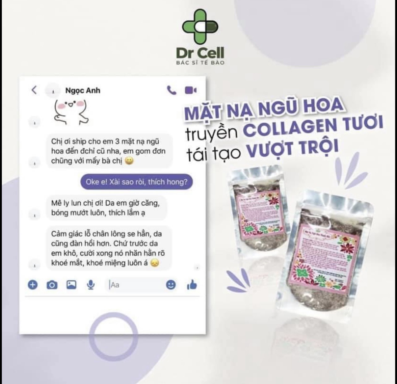 Mặt nạ ngũ hoa Dr Cell THÀNH PHẦN: kim ngân hoa, ké đầu ngựa, kinh giới, bồ công anh, linh kiều, hoa đào, vỏ quýt, linh chi đỏ... CÔNG DỤNG: Làm mát da, hút đi mủ trong mụn. Kiểm soát lượng dầu Làm mờ vết thâm nám, tàn nhang, Giúp da mặt căng bóng, trắng sáng, hết mụn nhọt, mụn cám trứng cá và mẩn ngứa do dị ứng. Sau khi đắp mặt nạ, cảm nhận đầu tiên là rất mát, da căng, mướt… Sau đó vùng da được chăm sóc trắng mịn lên. Lỗ chân lông được thu nhỏ lại giúp làn da trở nên mềm mại. CÁCH DÙNG: Pha với sữa tươi không đường hoặc nước ấm Lấy hai thìa cafe bột nạ ngũ hoa cho vào chén, cho thêm 5 muỗng nước lọc vào khuấy đều lấy tay bóp nhẹ cho ra hạt nở ra. Bóp nhẹ thấy mềm dẻo và kết dính là được. Xé nhẹ ra từng miếng nhỏ đắp lên từng vùng và dàn đều ra cho đến khi đắp hết mặt và thư giãn 20 phút. Trong lúc đắp nếu thấy da hấp thụ hết dịch làm mặt nạ khô thì có thể dùng cọ quét sữa tươi không đường lên hoặc quét nước mát cũng được. Đây là liệu pháp làm đẹp tạo Collagen TƯƠI cho da nhanh nhất và tiết kiệm nhất. Khi đắp nghe thoang thoảng vị thuốc bắc rất dễ chịu. Tuần có thể đắp 1-2 lần 1 gói đắp hơn 10 lần