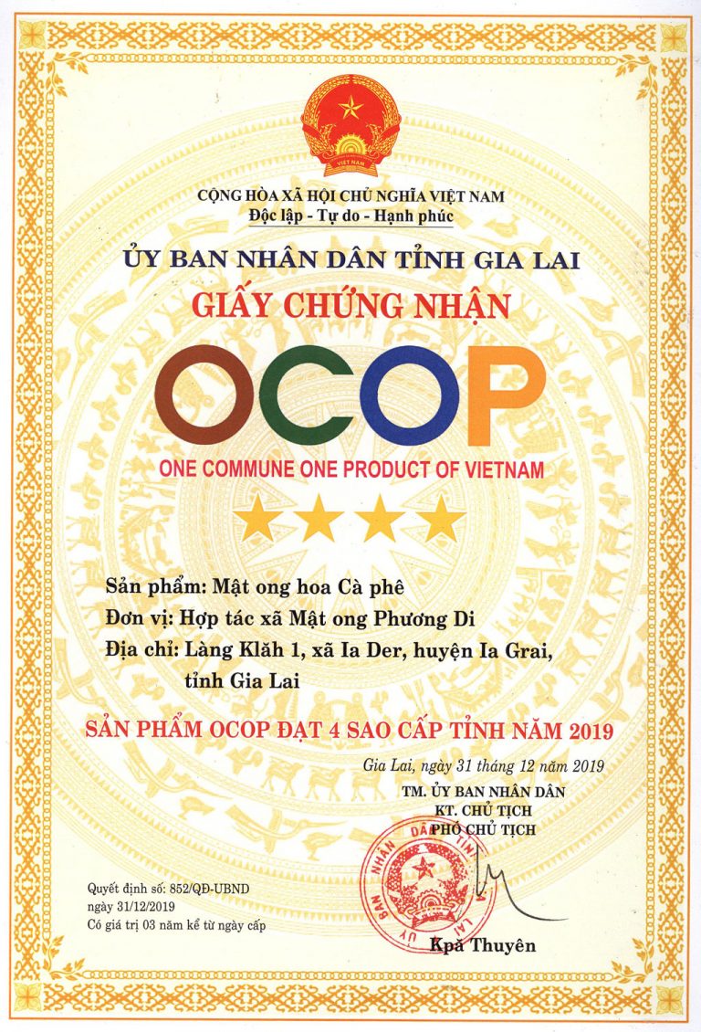 Mật ong hoa cà phê Phương Di, nuôi ong và khai thác mật theo tiêu chuẩn Vietgap: Mật ong tự nhiên 100%, Không chất bảo quản, không phụ gia, không hương liệu. Là sản phẩm đạt OCOP 4 sao duy nhất tỉnh Gia Lai 2019