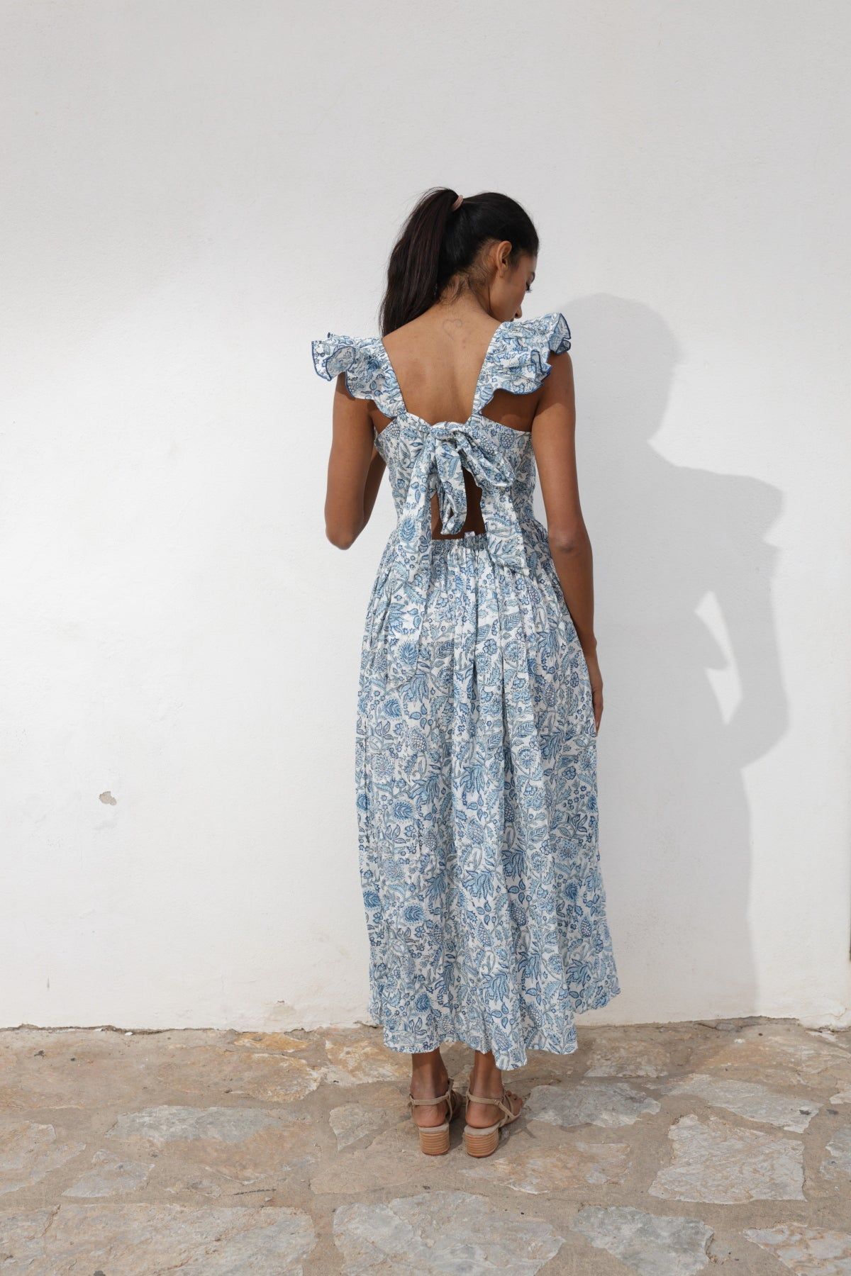 Maxi Đuôi Cá Hở Lưng Cotton Isla Bonita, chất liệu cotton cao cấp trên nển hoa nổi bật. Phần lưng sau hở cột nơ độc đáo. Phần thân trên có lớp lót. Eo thun co