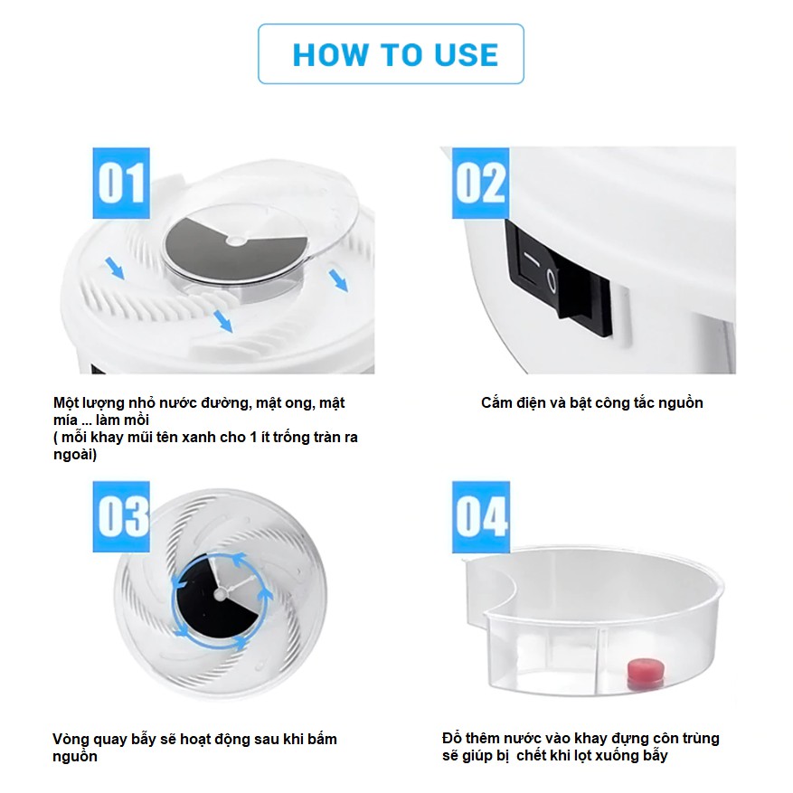 Hướng Dẫn Sử Dụng Máy bắt ruồi tự động B1: Cho mồi nhử ruồi ( sơ mít, thức ăn thừa, mật ong pha nước ...) vào khay tròn lõm trên bề mặt máy B2: Bật công tắc