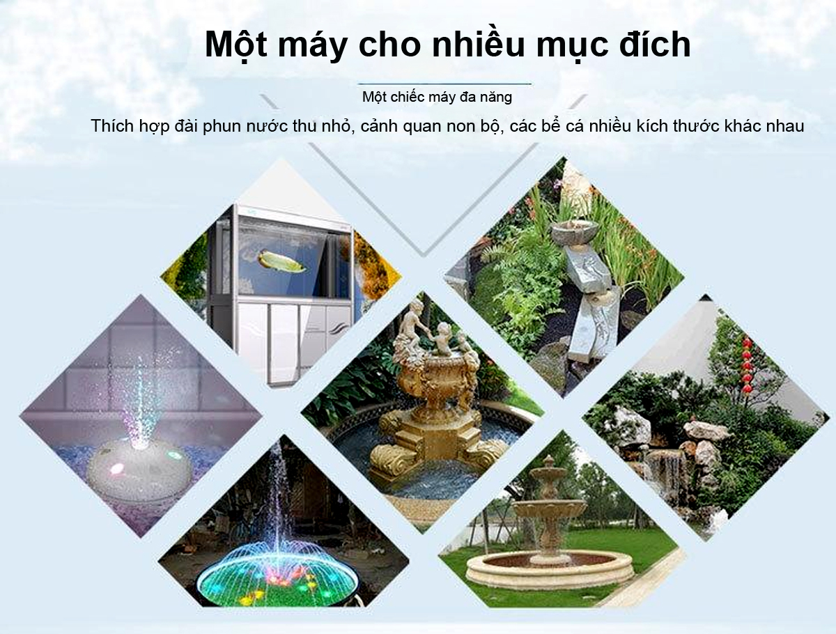 Dùng trong hệ thống bể lọc tràn dưới, cho hệ thống lọc thùng, hoặc đẩy thác, bơm luồng của hồ cá, bơm hệ thống aquaponic, tưới tiêu.