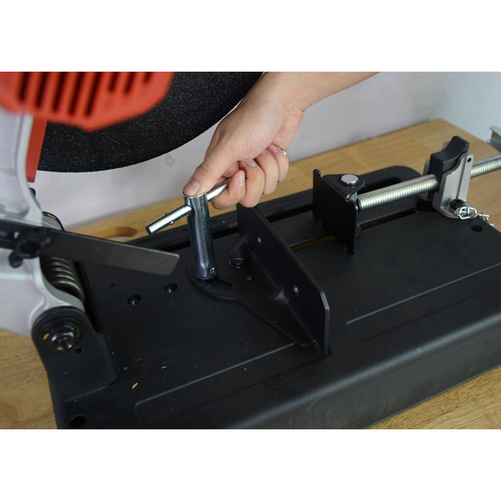 Máy cắt sắt có điều chỉnh góc cắt trong phạm vi 0 - 45 độ. Để điều chỉnh góc theo yêu cầu, chỉ cần nới lỏng các đinh ốc hãm 13 của cữ chặn góc bằng khóa đầu lục giác đi kèm 14 (8mm). Sau đó điều chỉnh góc muốn có và siết chặt cả hai vít khóa 13 lại như trước.