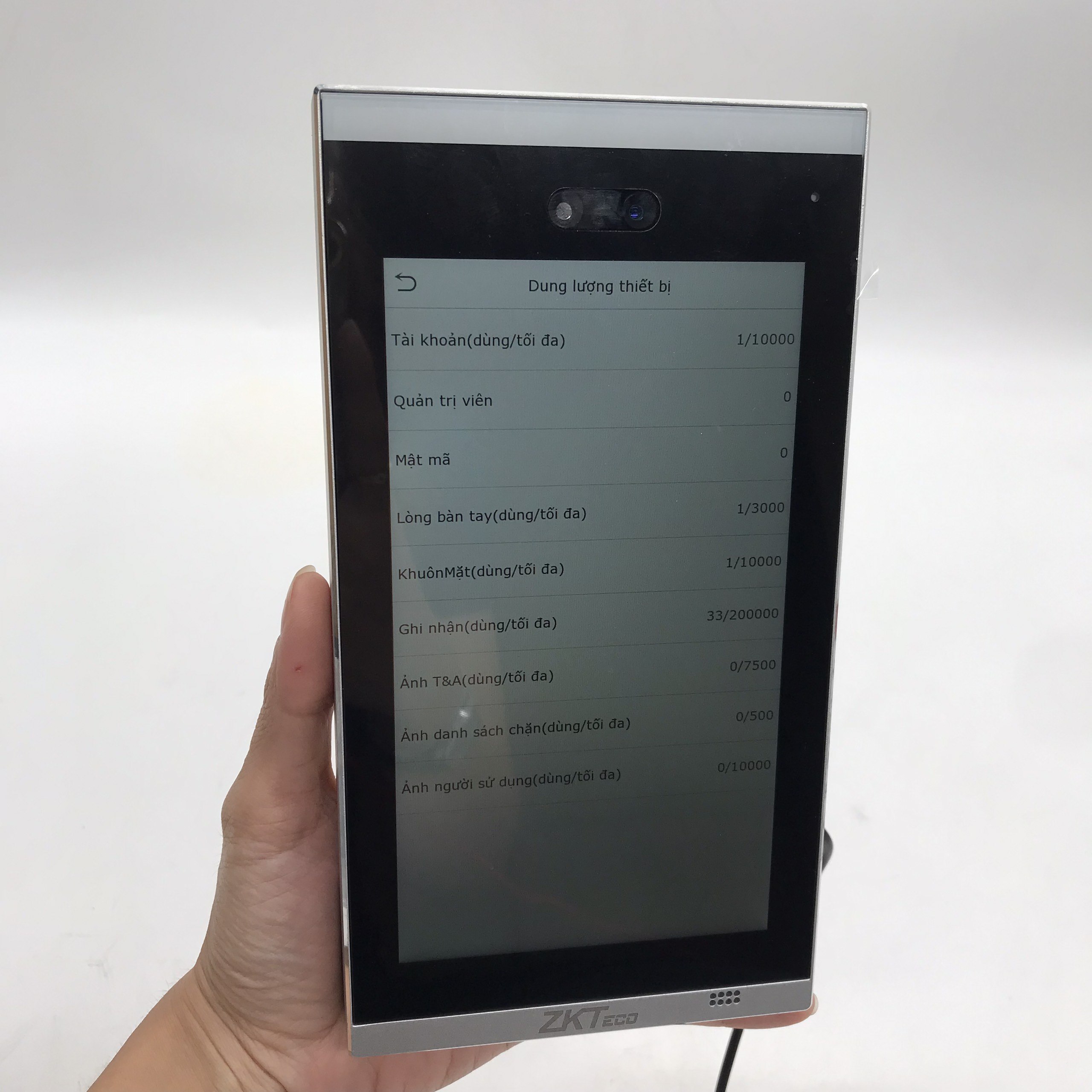 MÁY CHẤM CÔNG VÂN TAY, KHUÔN MẶT ZKTECO SenseFace 7B Mẫu máy: SenseFace 7B Hiển thị: 7"@ TFT Color Touch LED Screen (600*1024) Công suất khuôn mặt: 10.000 Dung lượng thẻ: 50.000 Dung lượng người