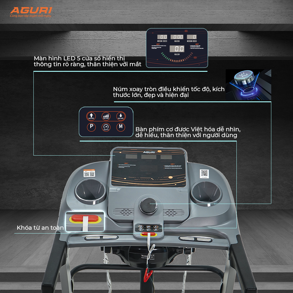 Máy chạy bộ AGURI AGT-115L *Thông tinmáy chạy bộ tại nhà AGURI AGT-115L - Motor DC công suất 3.5 HP - Màn hình LCD kích thước 5 inch hiển thị thời gian, quãng đường, vận