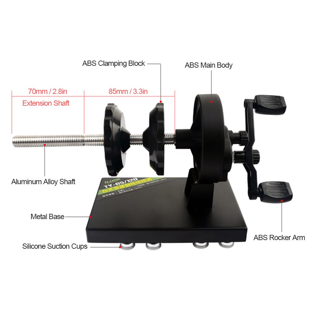 Features: 16 suction cups deliver strong power, easy to fix on the table, glass, tile, and other smooth surfaces. Threaded aluminum shaft with an extended shaft is adjustable to fit max. line spool length up