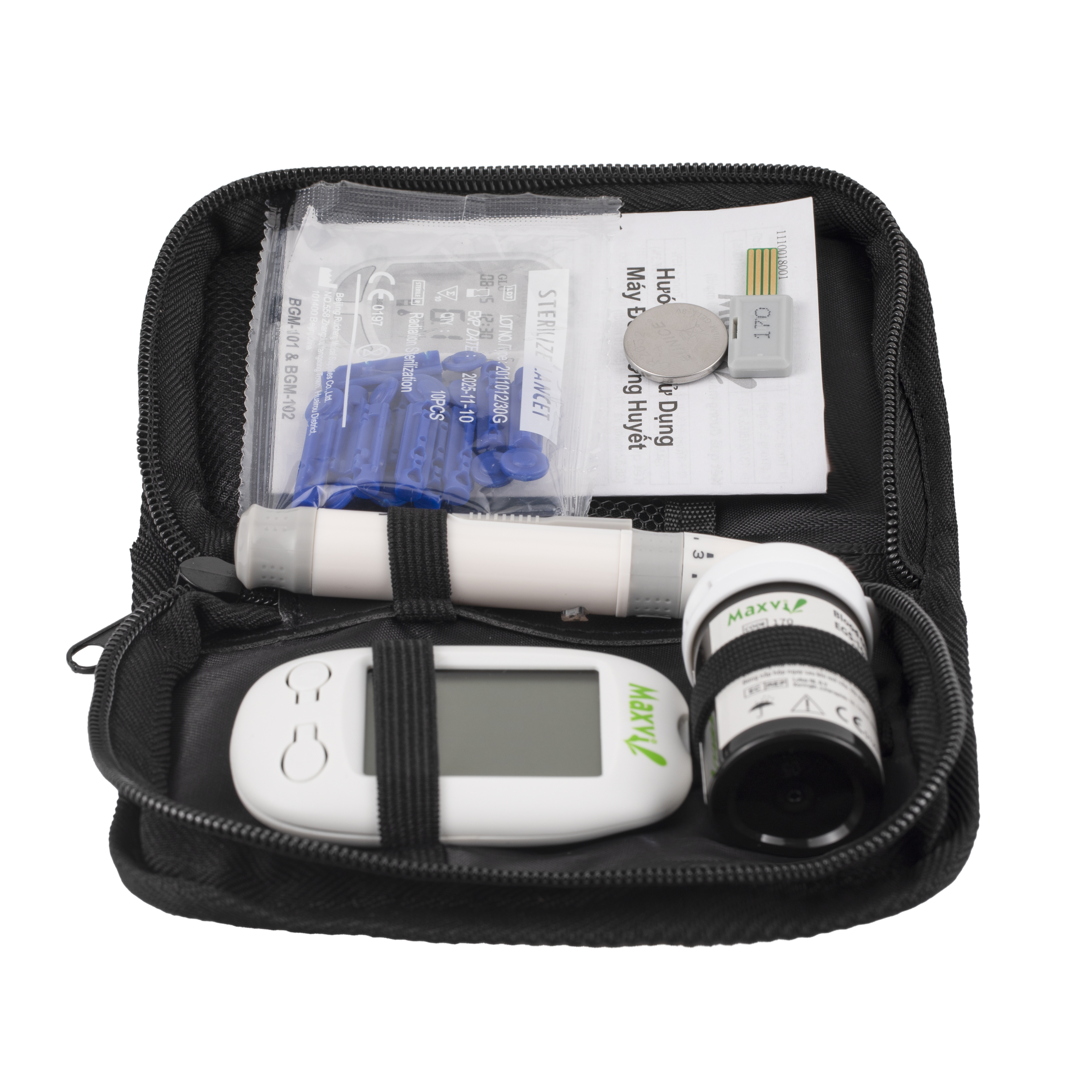 - BỘ MÁY ĐO ĐƯỜNG HUYẾT MAXVI BGM-102 (25 QUE): 1xMáy đo Maxvi BGM-102 1xBút lấy máu 1x Hộp 25 que thử (theo bộ 25 que) 1xTúi kim lấy máu 25 kim 1xHướng dẫn sử dụng 1xPin CR 1xThẻ bảo hành 5 năm 1xTúi đựng gọn nhẹ