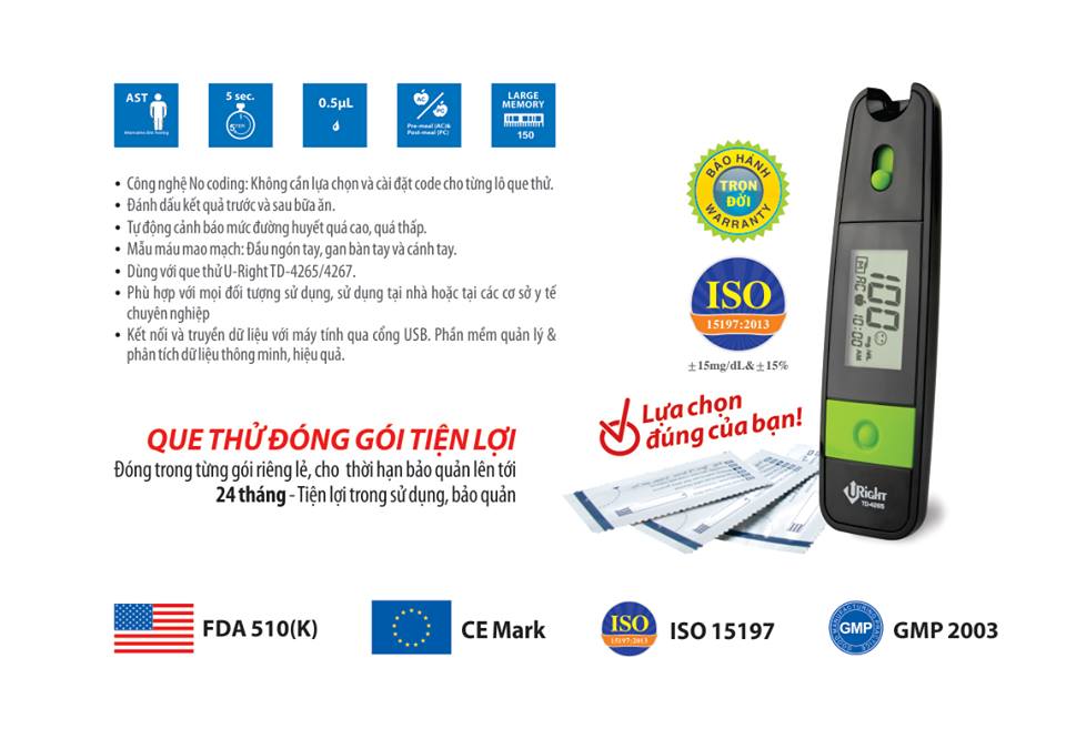 Máy Đo Đường Huyết Uright TD4265 là thiết bị thử máu lý tưởng dành cho các bệnh nhân tiểu đường, giúp theo dõi và kiểm tra lượng đường huyết thật nhanh chóng và chính xác. Máy có nhiều tính năng vượt trội, cách sử dụng đơn giản, cho kết quả chính xác, không bị ảnh hưởng nơi lấy máu. Máy đo đường huyết U-Right TD- 4265 được sản xuất bởi Liên doanh CHLB Đức – Đài Loan với công nghệ tiên tiến nhất. Với giá cả hợp lý và nguồn cung cấp que thử dồi dào, máy đo đường huyết U-Right TD-4265 sẽ là một thiết bị hữu ích giúp bạn tự tin theo dõi và kiểm soát đường huyết của mình một cách hiệu quả nhất.