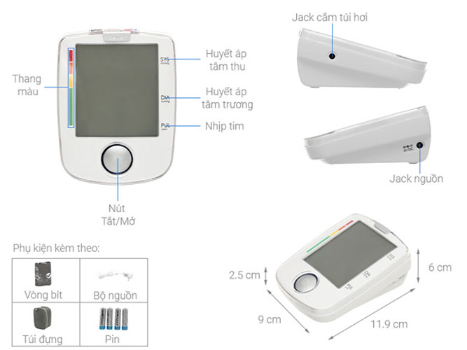 Mô tả: Vị trí đo: bắp tay, độ chính xác cao Tính năng: phân loại kết quả theo thang WHO, cảnh báo nhịp tim bất thường, báo cáo kết quả trung bình 3 lần đo,