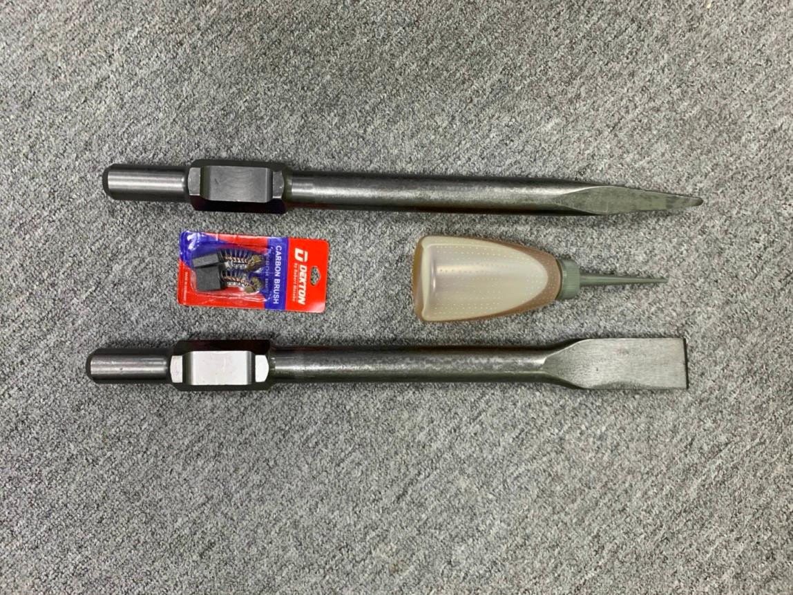 – Phụ kiện: 1 mũi đục dẹt và 1 mũi đục nhọn 30mm, 1 cặp chổi than