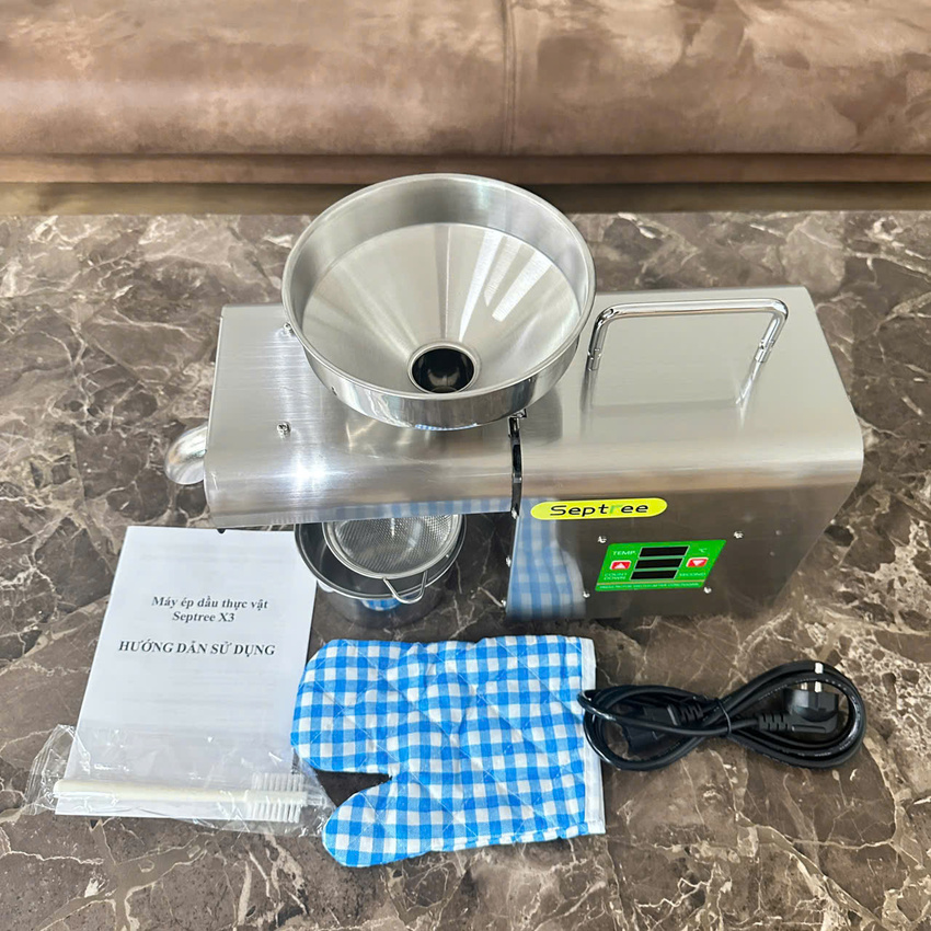- Vấn đề sức khỏe hiện nay đang rơi vào tình trạng đáng báo động khi, các chủ cơ sở sản xuất, hộ kinh doanh dầu ăn chỉ chạy theo lợi nhuận mà bất chấp cung cấp ra thị trường các loại dầu ăn giả, kém chất lượng, gây tổn hại đến sức khỏe và tính mạng người tiêu dùng. Cách tốt nhất bảo vệ bản thân và mọi người trong gia đình đó chính là tự ép dầu thực vật ngay tại nhà. Và Máy ép dầu thực vật Septree X3 là thiết bị giúp các chị em có thể tự chế biến dầu ăn sạch ngay tại nhà nhanh chóng, chẳng còn lo dầu bẩn, dầu giả. Máy ép dầu thực vật gia đìn Septree X3 với tính năng ưu việt, giúp bạn tự tay mình làm ra những chai dầu vàng óng, nguyên chất 100% từ những nguyên liệu hữu cơ: Lạc (đậu phộng), vừng (mè), dừa, hướng dương, đậu nành,… Máy ép dầu Septree X3 là sản phẩm được người tiêu dùng lựa chọn nhiều nhất hiện nay, bởi tính năng mang lại cho người sử nguồn thực phẩm sạch, an toàn cho sức khỏe.