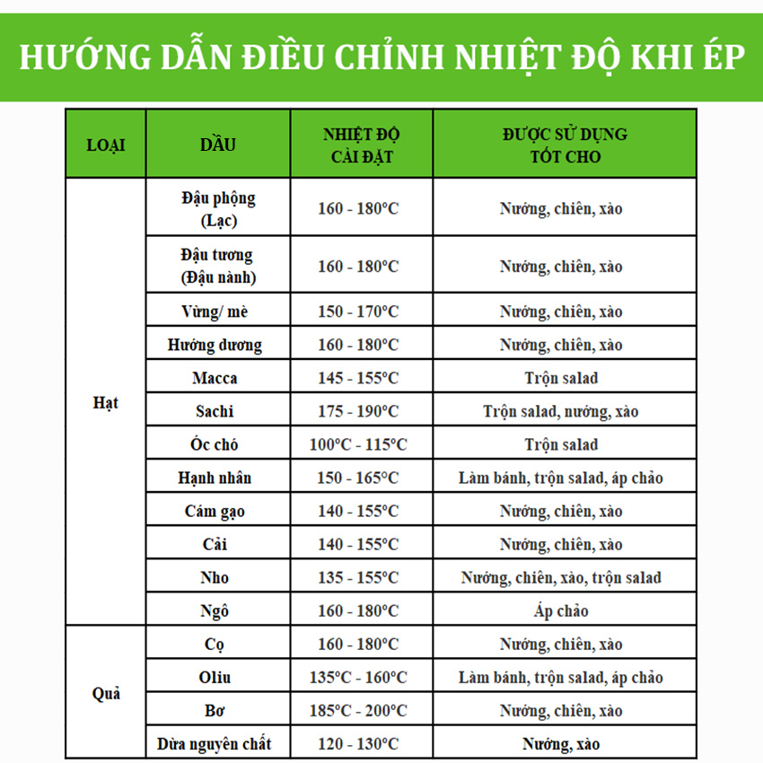 - Lưu ý: Tất cả các thông số trên chỉ là tương đối, còn sẽ tuỳ thuộc vào nguyên liệu thực tế để điều chỉnh thay đổi. Hàm lượng dầu của một số loại hạt: