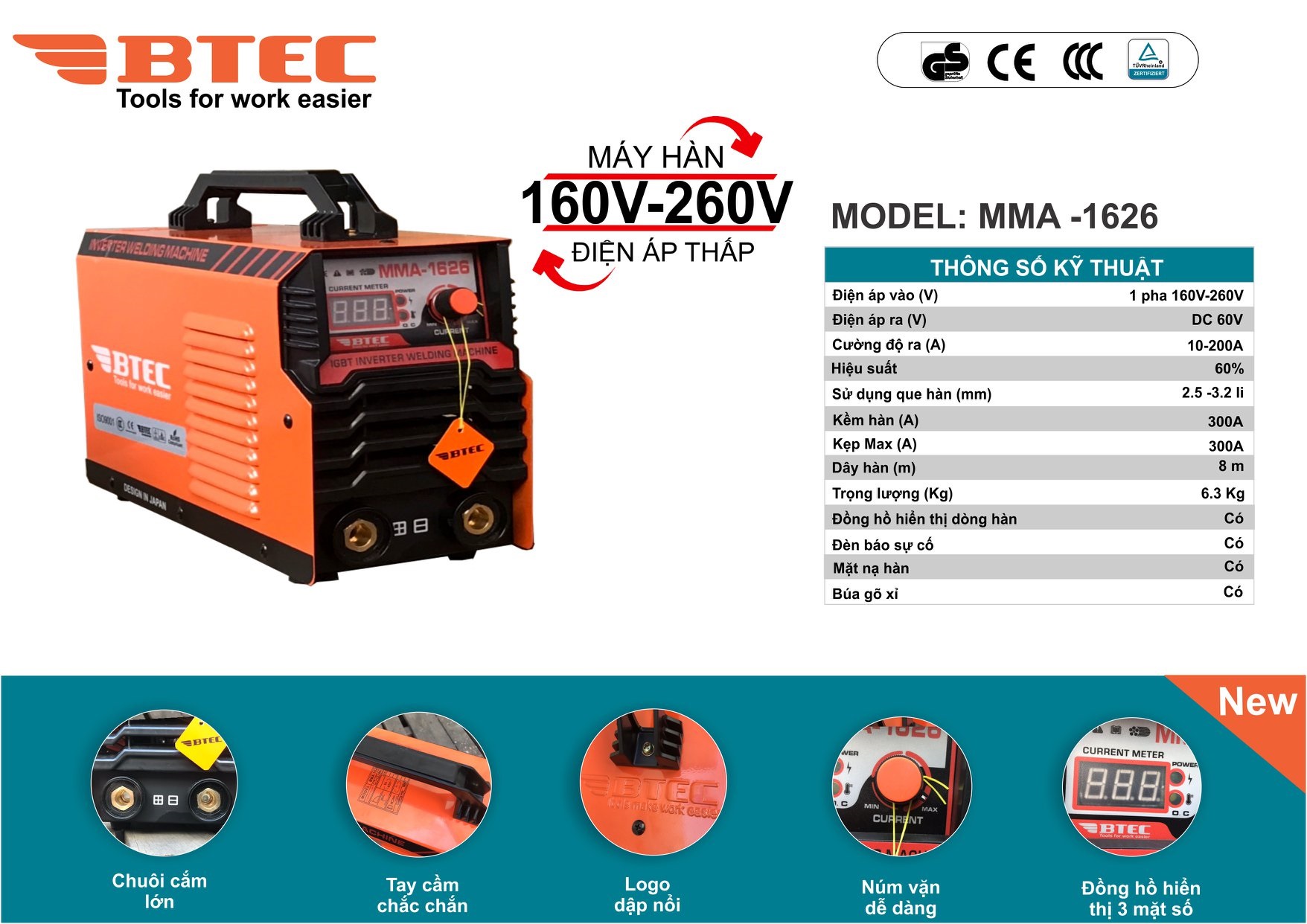 MMA-1626 đây là dòng máy hàn đặc biệt thích hợp được dùng cho những nơi điện yếu hoặc có nguồn điện không ổn định, khả năng hàn tốt, hàn liên tục que hàn 2.5mm.