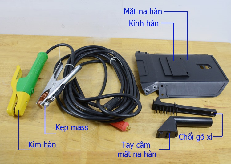 THÔNG TIN SẢN PHẨM 1pha-230V. 6,9KVA Dòng hàn ra 20-160A Kìm hàn với 1,5M cáp 16mm² Hàn que 3,2 liên tục Kẹp mass với 1,5M cáp 16mm² Hàn que 4,0 đính Trọng lượng 5,5kg Phụ