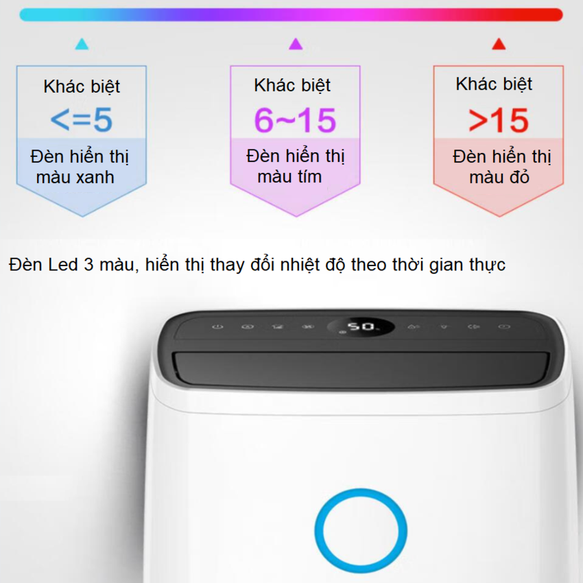 - Vòng màu LED hiển thị nhanh thông tin chi tiết khi không khí trong nhà bạn đạt đến một trong bốn mức độ ẩm dựa trên cài đặt từ 40% đến 70%. Chế độ tự động quản lý mức độ ẩm