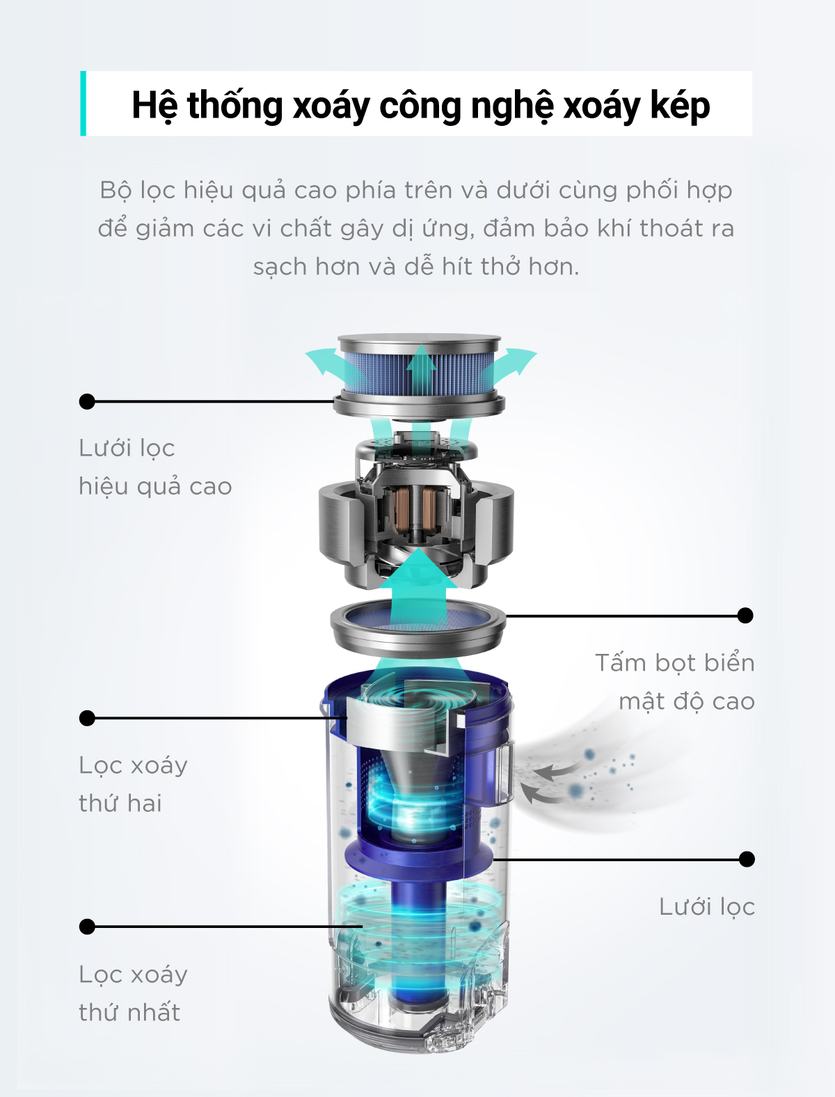 Im lặng: Với độ ồn hoạt động chỉ 43dB, cảm giác như đang thì thầm yên tĩnh. Mạnh mẽ: Trọng lượng 2kg của chính nó ép trực tiếp xuống sàn thông qua cấu trúc 'Không