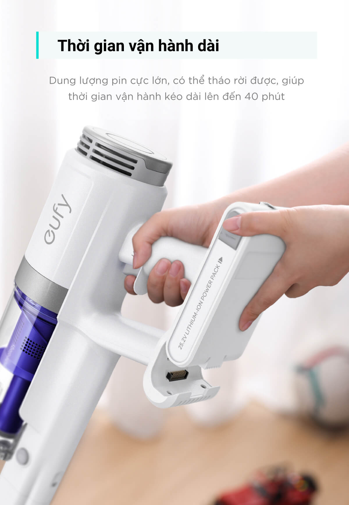 Loại bỏ bụi bẩn hàng ngày Công suất hút 75AW ấn tượng là quá đủ để loại bỏ mớ hỗn độn hàng ngày của bạn. Thời gian sử dụng cao Làm sạch toàn bộ ngôi