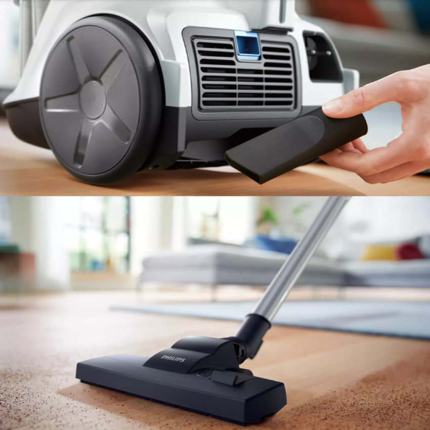 Công nghệ hút bụi lốc xoáy hiện đại không túi chứa bụi Đặc biệt thiết thực nhờ thiết kế nhỏ gọn Dễ dàng đổ sạch hộp chứa bụi chỉ bằng một nút nhấn Xử lý
