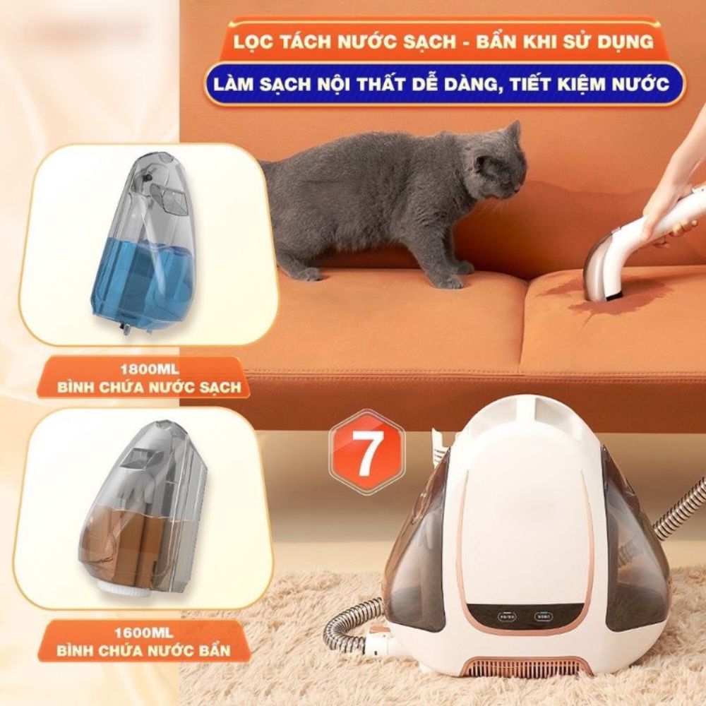 Máy Hút Giặt Cầm Tay B100 Đa Năng, Di Động Chuyên Dùng Cho Sofa, Nệm, Rèm, Thảm, Đánh Bật Mọi Vết Bẩn - Hàng Chính Hãng GIỚI THIỆU VỀ SẢN PHẨM -Làm sạch sâu từ bên trong -Giặt sạch và làm khô vải ngay sau khi vệ sinh -Chế độ hút sạch bụi bẩn, lông thú nuôi -Vận hành êm ái, giảm tiếng ồn Lọc tách nước sạch, bẩn khi sử dụng -Máy hút giặt - “trợ thủ” đắc lực giúp bạn vệ sinh và đánh bay các vết bẩn cứng đầu trên sofa, giường nệm, thảm trải sàn,… dễ dàng trong một nốt nhạc. Ưu điểm của máy hút giặt thảm, sofa  -Lực hút mạnh mẽ, độ ồn thấp -Đặc biệt, lực hút lốc xoáy của thiết bị còn giúp xâm nhập đến tận sâu lớp vải, hỗ trợ hút sạch các vết nước thẩm thấu bên trong sofa. Sản phẩm còn trang bị công nghệ giảm tiếng ồn từ tính được cấp bằng sáng chế, hỗ trợ động cơ chạy êm ái và không làm ảnh hưởng đến giấc ngủ của trẻ. -Thân máy nhỏ gọn, dễ dàng di chuyển -Máy hút giặt B100 sở hữu ngoại hình độc đáo với thân máy nhỏ gọn 390 x 413mm, thuận tiện để người dùng bố trí ở mọi nơi mà không lo nó chiếm quá nhiều diện tích. Bên cạnh đó, việc tích hợp các bánh xe phía dưới giúp máy dễ dàng di chuyển đến nhiều nơi, hỗ trợ làm sạch mọi ngóc ngách trong nhà từ thảm, sofa,… cho đến giường nệm,… -Dung tích bình chứa lớn, tự động làm sạch -Thiết kế bể nước lớn với dung tích 1800ml giúp bạn thoải mái vệ sinh và làm sạch thảm, nệm dễ dàng, không cần phải thêm nước nhiều lần. Đặc biệt, việc sử dụng bàn chải tròn lông mềm với độ dày chỉ 0.02mm, đảm bảo mang đến khả năng thẩm thấu tốt hơn và không làm ảnh hưởng đến bề mặt vải. -Ngoài ra,  cũng được trang bị tính năng tự động làm sạch chỉ với 1 nút, giúp người dùng dễ dàng vệ sinh mà không cần tốn công cọ rửa. Thông số: -Áp lực hút: 9000-12000PA -Dung tích 2 bình nước: 1600vs 1800ml -Dây dài 5m -Công suất: 300-450W