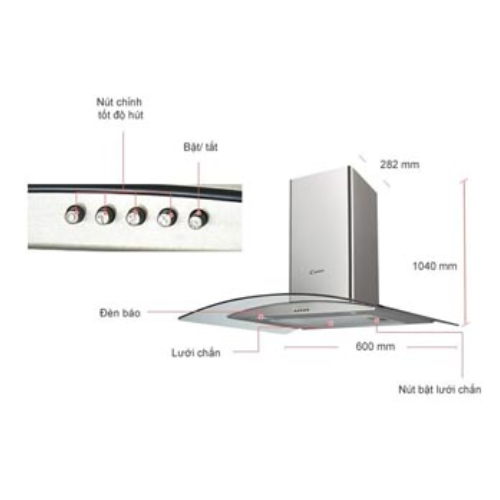 Thông số kỹ thuật: • Máy hút mùi kính cong • Thân máy bằng inox sáng đẹp • Kính cường lực dày 5mm tráng men bóng cao cấp • Điều khiển phím bấm 3 tốc