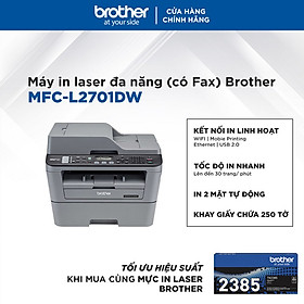 Máy in Laser Brother MFC-L2701DW sử dụng kết nối không dây nâng cao khả năng tương tác với thiết bị ngoài, đặc biệt là điện thoại hay máy tính bảng thông qua iPrint & Scan. Tính năng in 2 mặt tự động giúp bạn có thể tiết kiệm thời gian và tiền bạc khi tận dụng hết 2 mặt của giấy.