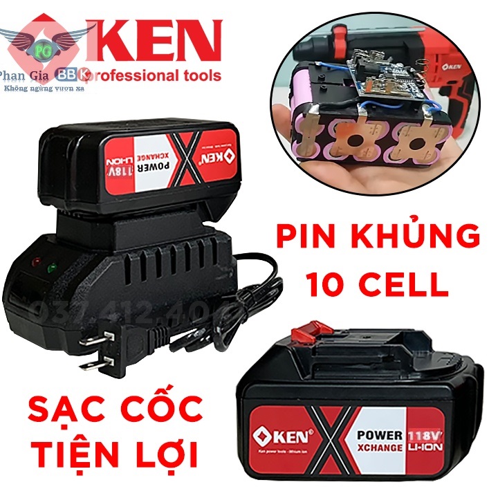 - Máy Khoan đục Bê tông dùng pin KEN 118V 3 chức năng - Pin 10 CELL - Động cơ từ - Máy Khoan Có Búa