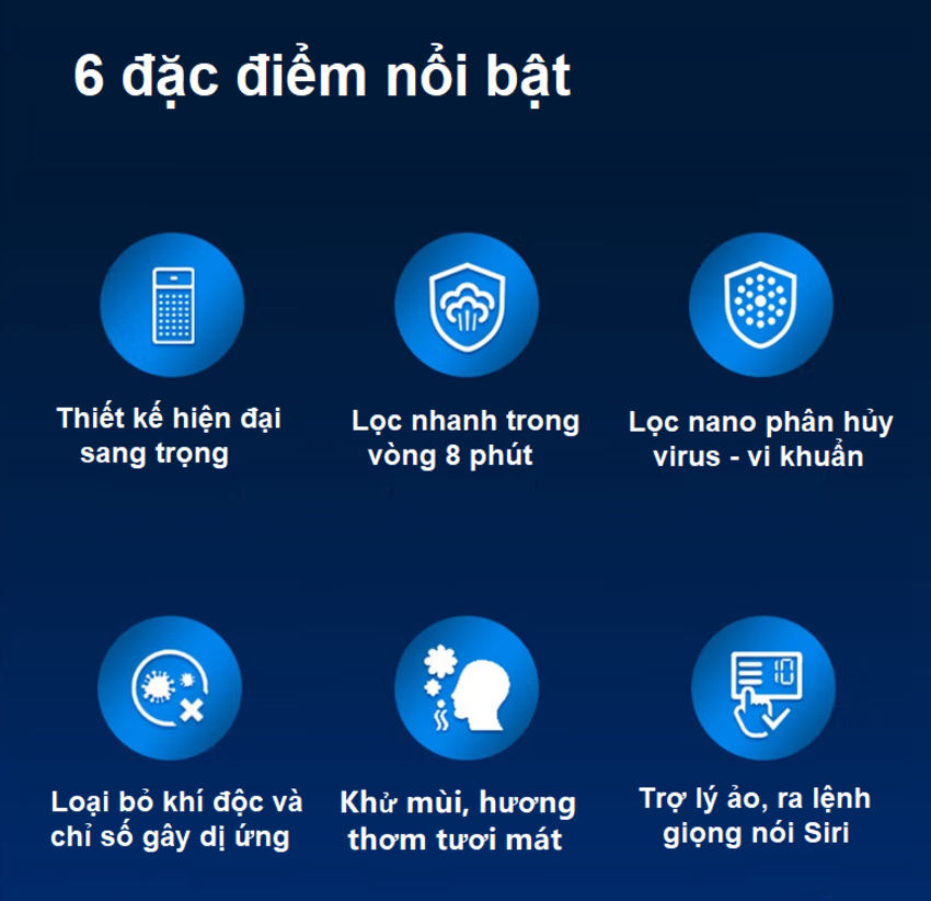 - Loại bỏ loại bỏ khí độc hại và mùi hôi - Hiệu suất làm sạch khí: Với động cơ kép, lọc sạch không khí chỉ trong 8 phút, kể cả vi rút, vi khuẩn và các chất độc hại