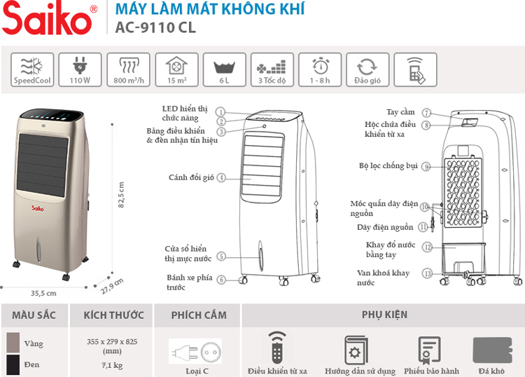 Song hành với chức năng làm mát, Saiko AC-9110CL còn mang lại cho không gian bầu không khí trong lành với tấm chặn côn trùng và lọc bụi. Tấm lọc bụi làm sạch không khí được lưu thông, cung cấp cho bạn, không khí trong lành mát mẻ đồng thời cản côn trùng xâm nhập máy do đó máy sẽ an toàn và sạch hơn.