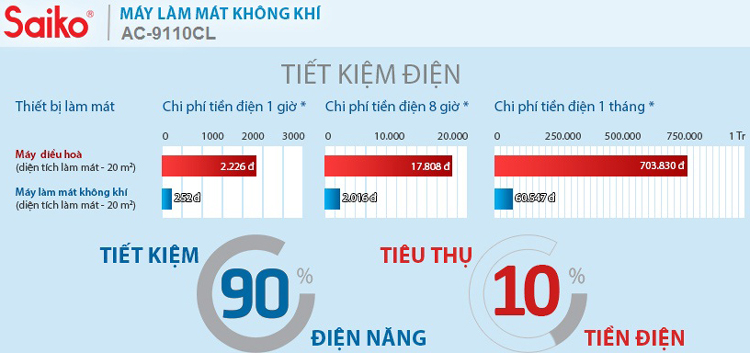 Máy làm lạnh Saiko tiết kiệm chi phí ban đầu khoảng 30 - 40% so với máy điều hoà không khí cùng diện tích sử dụng, không tốn chi phí lắp đặt, bảo trì. Trong cùng một diện tích sử dụng thì thiết bị chỉ tiêu hao bằng 10% đến 12% điện năng so với máy điều hòa không khí.