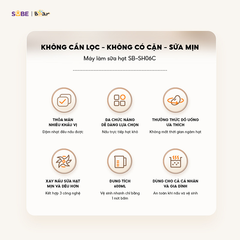 Mô Tả Sản Phẩm Máy làm sữa hạt Bear 0.6L SB-SH06C với màu kem sang trọng không chỉ giúp bạn xay nấu những ly sữa hạt bổ dưỡng mà còn là vật dụng decor làm