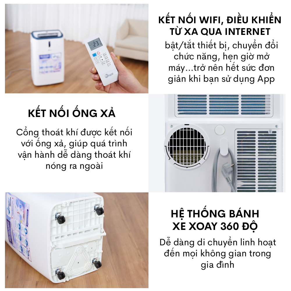 • Hút ẩm trong điều kiện trời nồm -  Máy điều hòa di động FujiE MPAC12 có thể được sử dụng như một máy hút ẩm thực thụ với công suất hút ẩm lên đến 30.3 lít/ngày, có thể thoát nước thải liên tục qua ống hoặc xuống bình chứa bên dưới máy (dung tích 0.6 lít)     Khả năng kết nối wifi, điều khiển từ xa qua internet Thông qua ứng dụng App có thể tải xuống miễn phí trên Google Play hoặc App Store, người dùng hoàn toàn có thể kết nối điều hòa máy điều hòa FujiE, với các thiết bị di động để điều khiển máy từ xa. Những thao tác như bật/tắt thiết bị, chuyển đổi chức năng, hẹn giờ mở máy…trở nên hết sức đơn giản khi bạn sử dụng App để điều khiển máy, Đồng thời máy cũng được trang bị điều khiển từ xa tiện lợi, thông minh. Hoạt động bền bỉ, tiếng ồn nhỏ Máy điều hòa di động MPAC12 sử dụng máy nén liên doanh TOSHIBA GMCC, đi kèm dàn tản nhiệt 100% đồng nguyên chất cho hiệu năng hoạt động siêu bền bỉ và hiệu suất làm lạnh cao trong mọi điều kiện thời tiết đặc thù của khí hậu Việt Nam.   Máy lạnh di động FujiE có cả 2 bộ phận cục nóng và cục lạnh gắn trên cùng 1 thiết bị nên sẽ được cho là gây ra tiếng ồn lớn hơn so với điều hoà 2 cục nóng lạnh riêng biệt thường thấy, Tuy nhiên Máy lạnh FujiE được lắp đặt máy nén liên doanh TOSHIBA GMCC nổi tiếng có độ ồn thấp chỉ từ 56dB