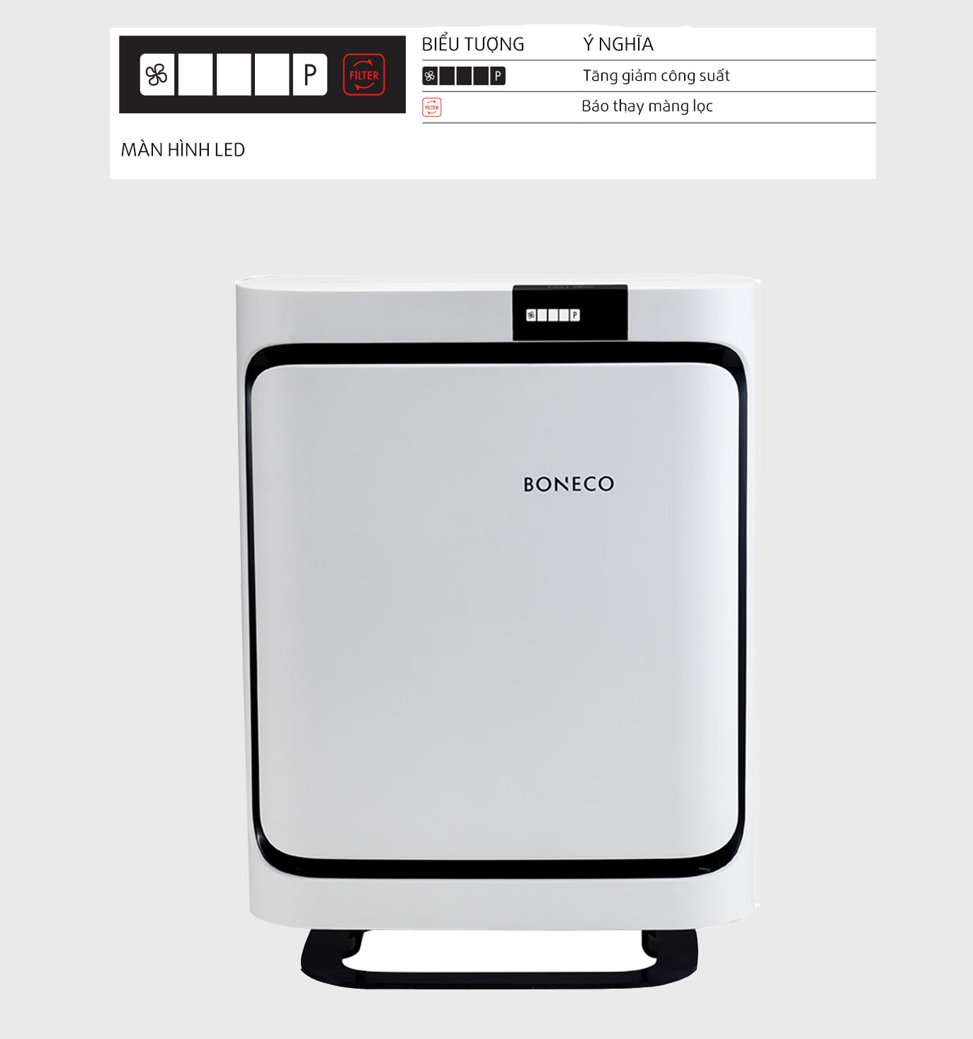 - Máy lọc không khí BONECO P400 có màn hình kỹ thuật số cùng phím bấm cảm ứng. Thao tác sử dụng đơn giản, thông minh, tự động lọc không khí chỉ bằng 1 nút bấm, báo nhắc nhở thay bộ lọc