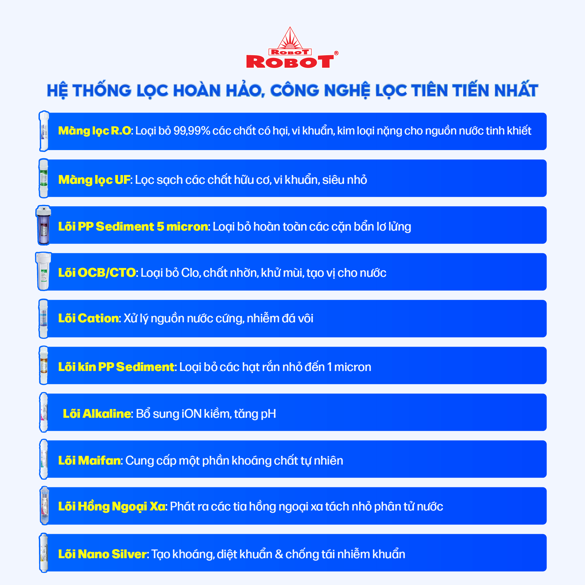 • Máy được tích hợp 2 công nghệ lọc tối ưu nhất hiện nay là UF (Ultrafiltration) & R.O (Reverse Osmosis) cho nguồn nước sau lọc sạch tối đa, được loại bỏ hoàn toàn cặn bẩn hay chất gây hại.   Với công nghệ “Bảo vệ 3 tầng”, máy lọc nước ROBOT được các chuyên gia đánh giá là sản phẩm bảo vệ tuyệt đối an toàn cho sức khỏe   Hệ thống đa cấp lọc mạnh mẽ của ROBOT SPRING PRO 9410G-UR
